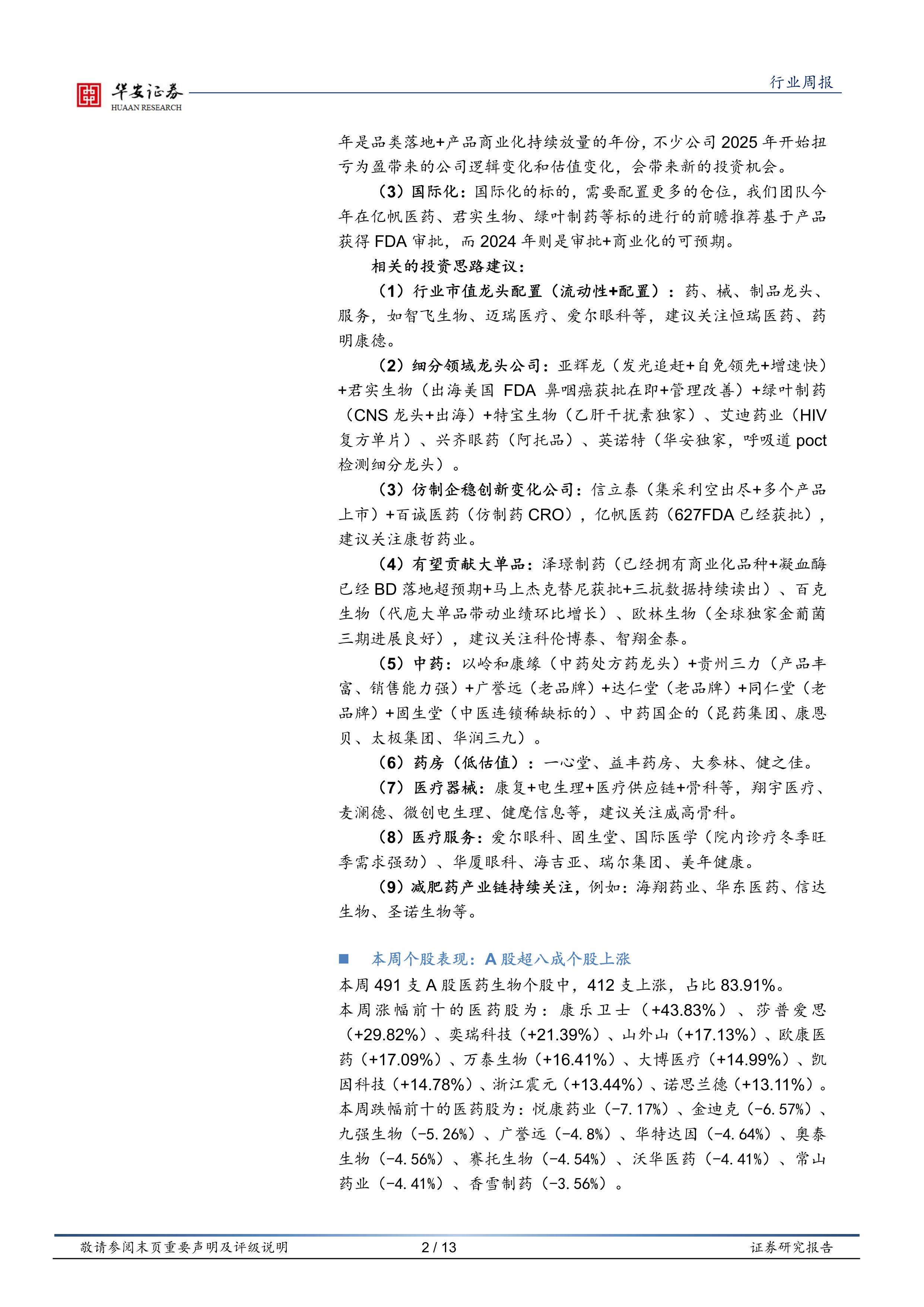 本部分分别分析了A股和港股医药生物个股的表现,列出了涨幅前十和跌幅前十的个股,并对部分个股进行了简要点评。数据显示,A股市场超八成个股上涨,港股市场近十成个股上涨。