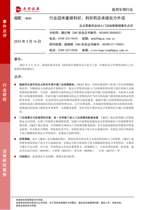 定点零售药店纳入门诊统筹管理事件点评:行业迎来重磅利好,利好药店承接处方外流