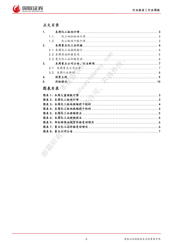 本报告对本周化工板块行情、重点化工品价格、重点公司公告及行业新闻进行了全面分析,并基于此给出了对化工行业“强于大市”的投资评级,并推荐了具体的投资标的。报告同时指出了潜在的投资风险,提醒投资者谨慎决策。 报告数据主要来源于Wind、百川盈孚以及国联证券研究所的预测,投资者需自行判断信息的准确性和完整性,并结合自身情况进行投资决策。