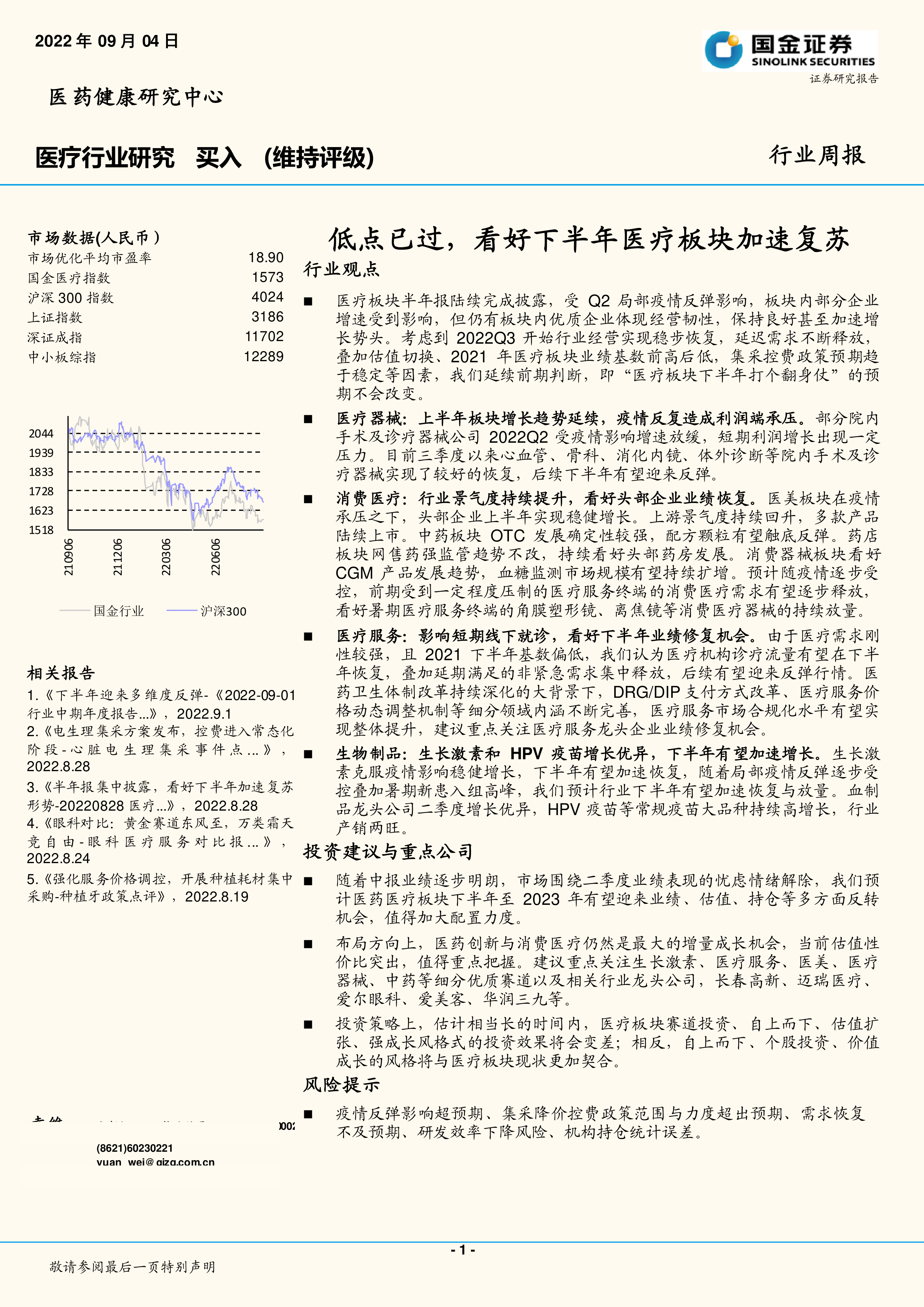 本报告的核心观点是:尽管2022年上半年医疗板块受局部疫情反弹影响,部分企业增速放缓,但优质企业展现出经营韧性。基于2022年Q3行业经营稳步恢复、延迟需求释放、估值切换、集采控费政策趋于稳定等因素,我们维持前期判断,即医疗板块下半年将强势反弹,看好其后续表现。 报告重点关注生物制品(生长激素和HPV疫苗)、医疗器械(尤其院内手术及诊疗器械)、消费医疗(医美、中药、药店、消费器械)和医疗服务四个细分领域,并推荐了一系列重点公司。 投资策略上,建议转向自上而下、个股投资、价值成长的风格,而非赛道投资、估值扩张、强成长风格。
