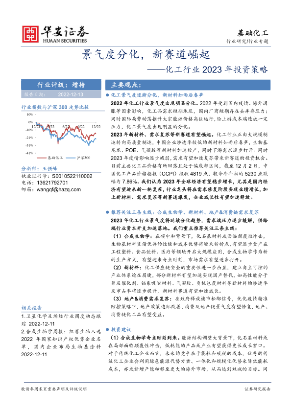 本报告的核心观点是:2023年化工行业景气度将延续分化趋势,但新材料和需求复苏将带来新的投资机会。报告建议关注合成生物学、新材料和地产/消费链需求复苏三大主线,并推荐了多家行业龙头和细分赛道“隐形冠军”企业。