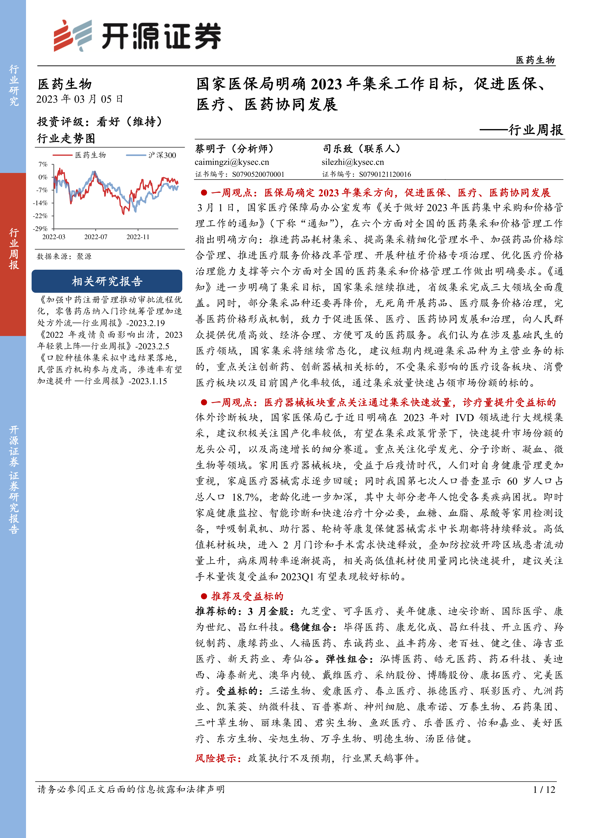 医药生物行业周报:国家医保局明确2023年集采工作目标,促进医保、医疗、医药协同发展