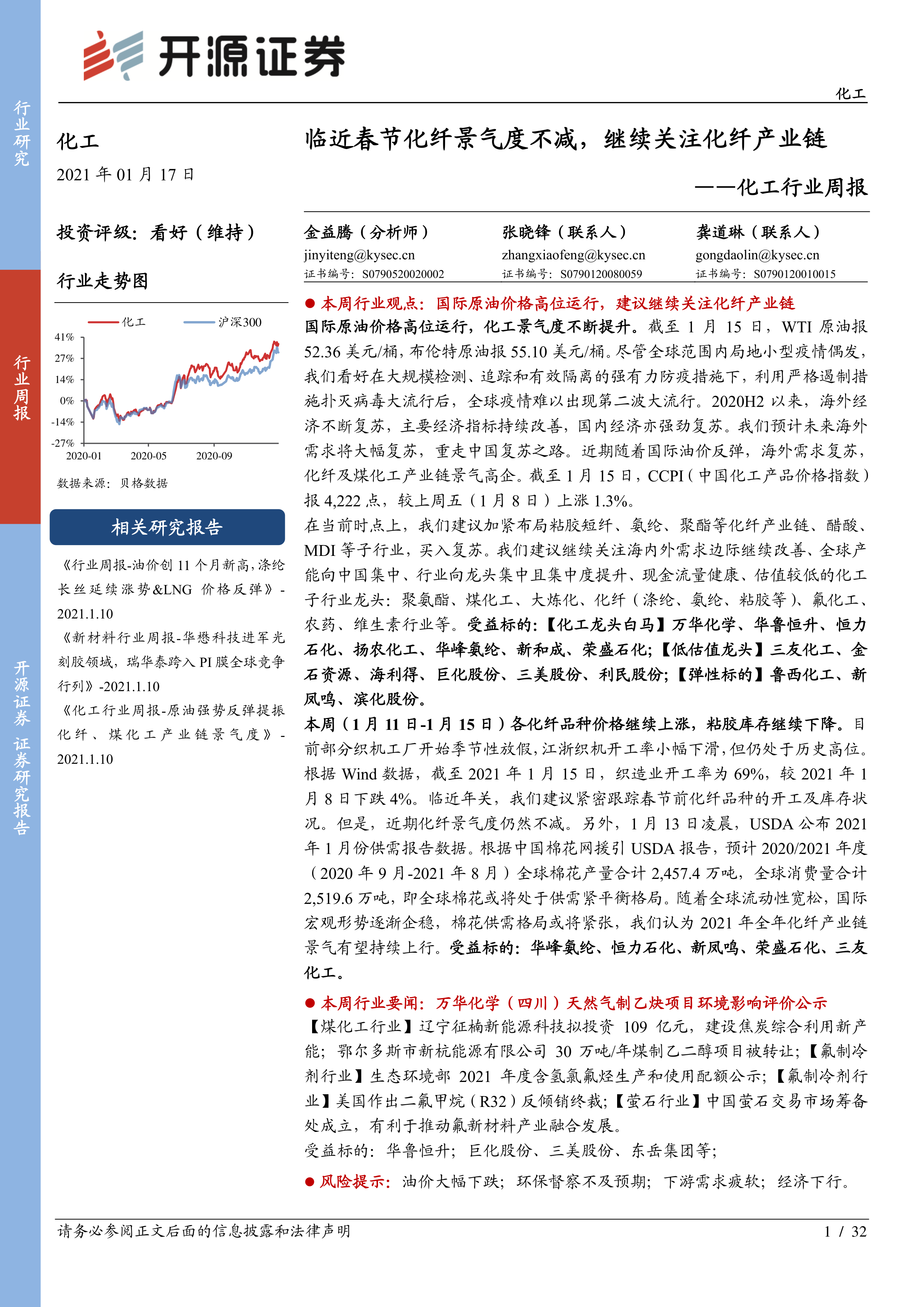 国际原油价格高位运行,化工景气度不断提升。截至1月15日,WTI原油报52.36美元/桶,布伦特原油报55.10美元/桶。尽管全球范围内局地小型疫情偶发,我们看好在大规模检测、追踪和有效隔离的强有力防疫措施下,利用严格遏制措施扑灭病毒大流行后,全球疫情难以出现第二波大流行。2020H2以来,海外经济不断复苏,主要经济指标持续改善,国内经济亦强劲复苏。我们预计未来海外需求将大幅复苏,重走中国复苏之路。近期随着国际油价反弹,海外需求复苏,化纤及煤化工产业链景气高企。截至1月15日,CCPI(中国化工产品价格指数)报4,222点,较上周五(1月8日)上涨1.3%。