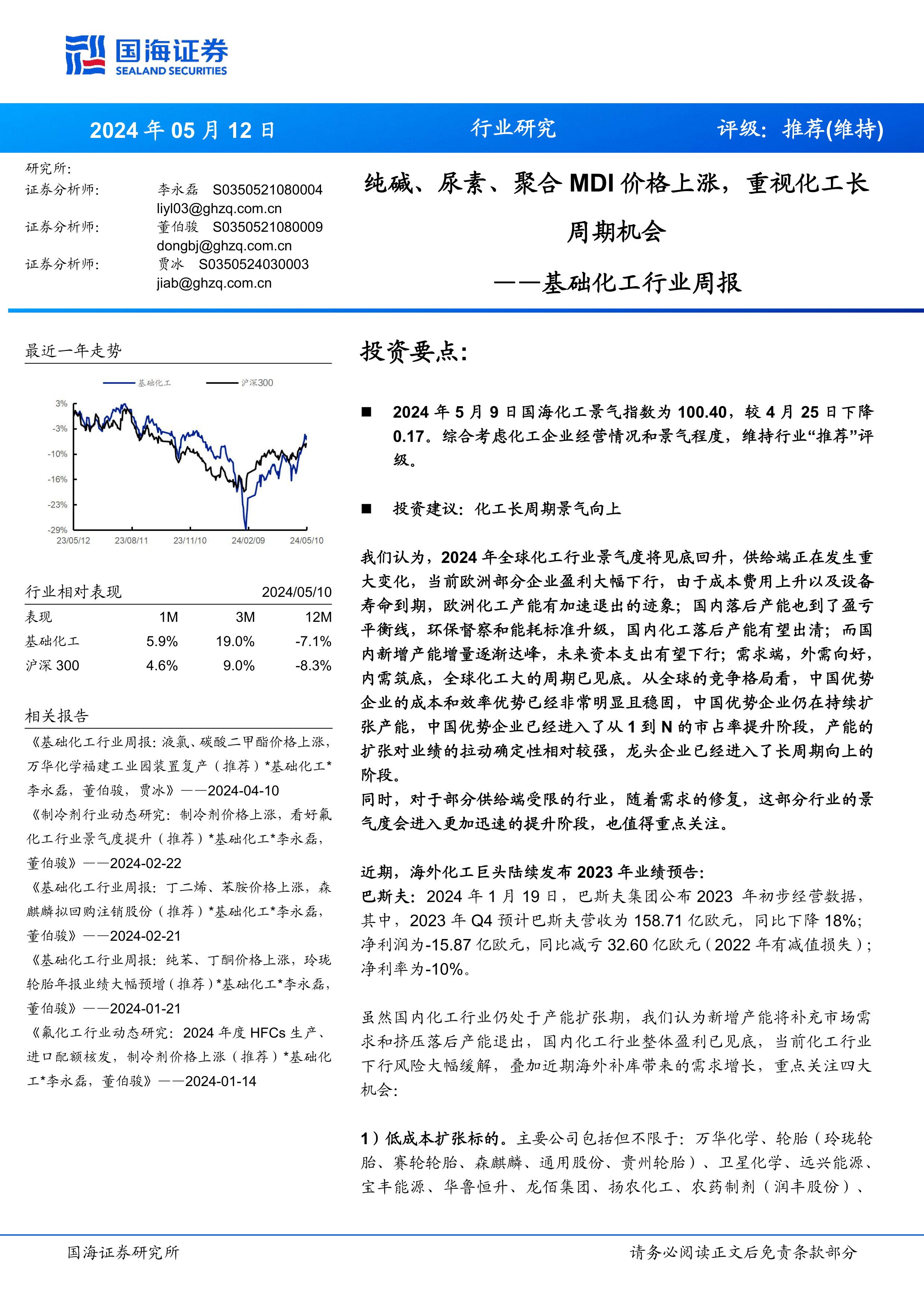 本报告基于2024年5月9日的数据,对基础化工行业进行分析,并对重点公司进行跟踪。