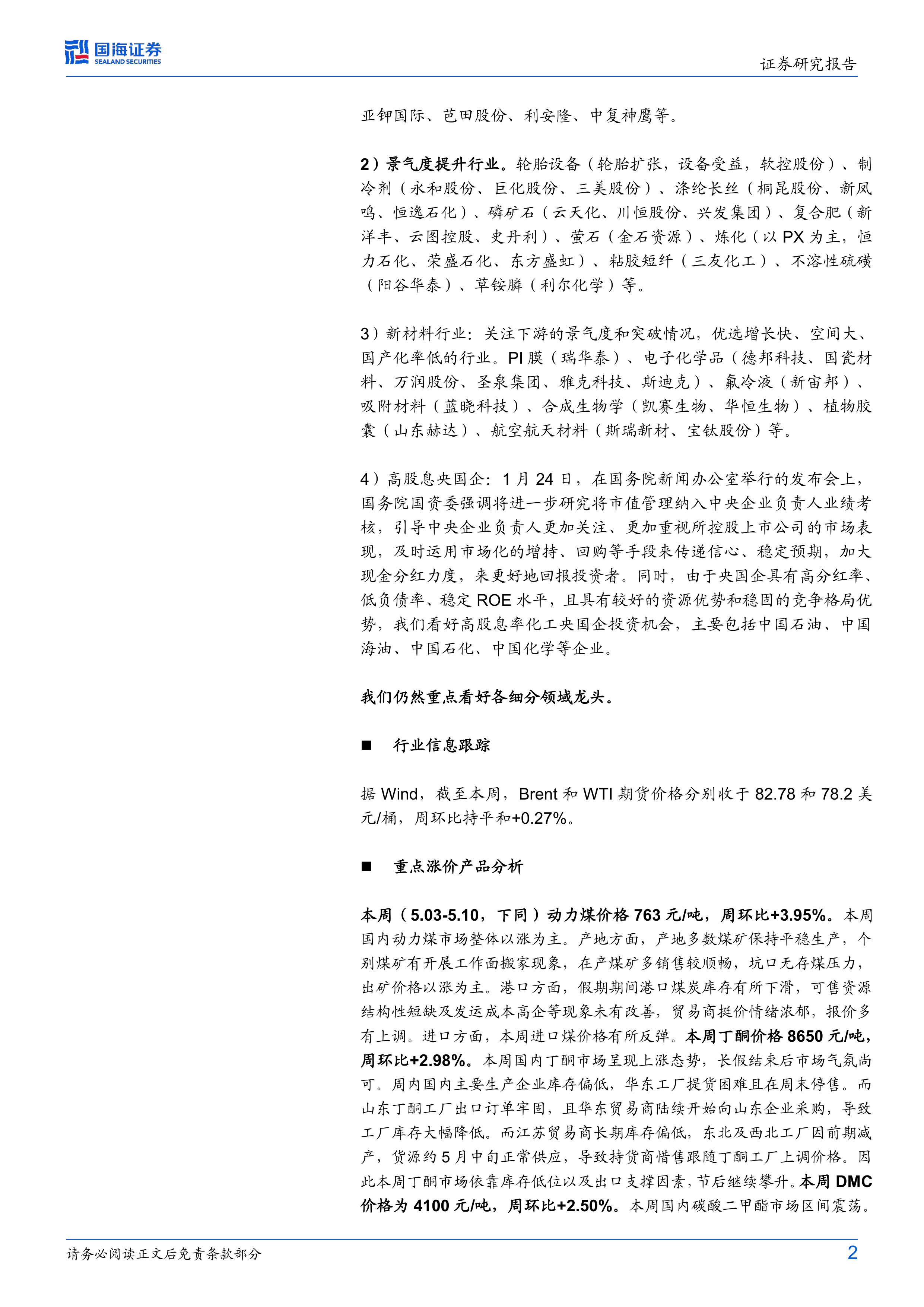 本周( 5.03-5.10, 下同) 动力煤价格 763 元/吨, 周环比+3.95%。 本周国内动力煤市场整体以涨为主。 产地方面, 产地多数煤矿保持平稳生产, 个别煤矿有开展工作面搬家现象, 在产煤矿多销售较顺畅, 坑口无存煤压力,出矿价格以涨为主。 港口方面, 假期期间港口煤炭库存有所下滑, 可售资源结构性短缺及发运成本高企等现象未有改善, 贸易商挺价情绪浓郁, 报价多有上调。 进口方面, 本周进口煤价格有所反弹。 本周丁酮价格 8650 元/吨,周环比+2.98%。 本周国内丁酮市场呈现上涨态势, 长假结束后市场气氛尚可。 周内国内主要生产企业库存偏低, 华东工厂提货困难且在周末停售。 而山东丁酮工厂出口订单牢固, 且华东贸易商陆续开始向山东企业采购, 导致工厂库存大幅降低。 而江苏贸易商长期库存偏低, 东北及西北工厂因前期减产, 货源约 5 月中旬正常供应, 导致持货商惜售跟随丁酮工厂上调价格。 因此本周丁酮市场依靠库存低位以及出口支撑因素, 节后继续攀升。 本周 DMC价格为 4100 元/吨, 周环比+2.50%。 本周国内碳酸二甲酯市场区间震荡。