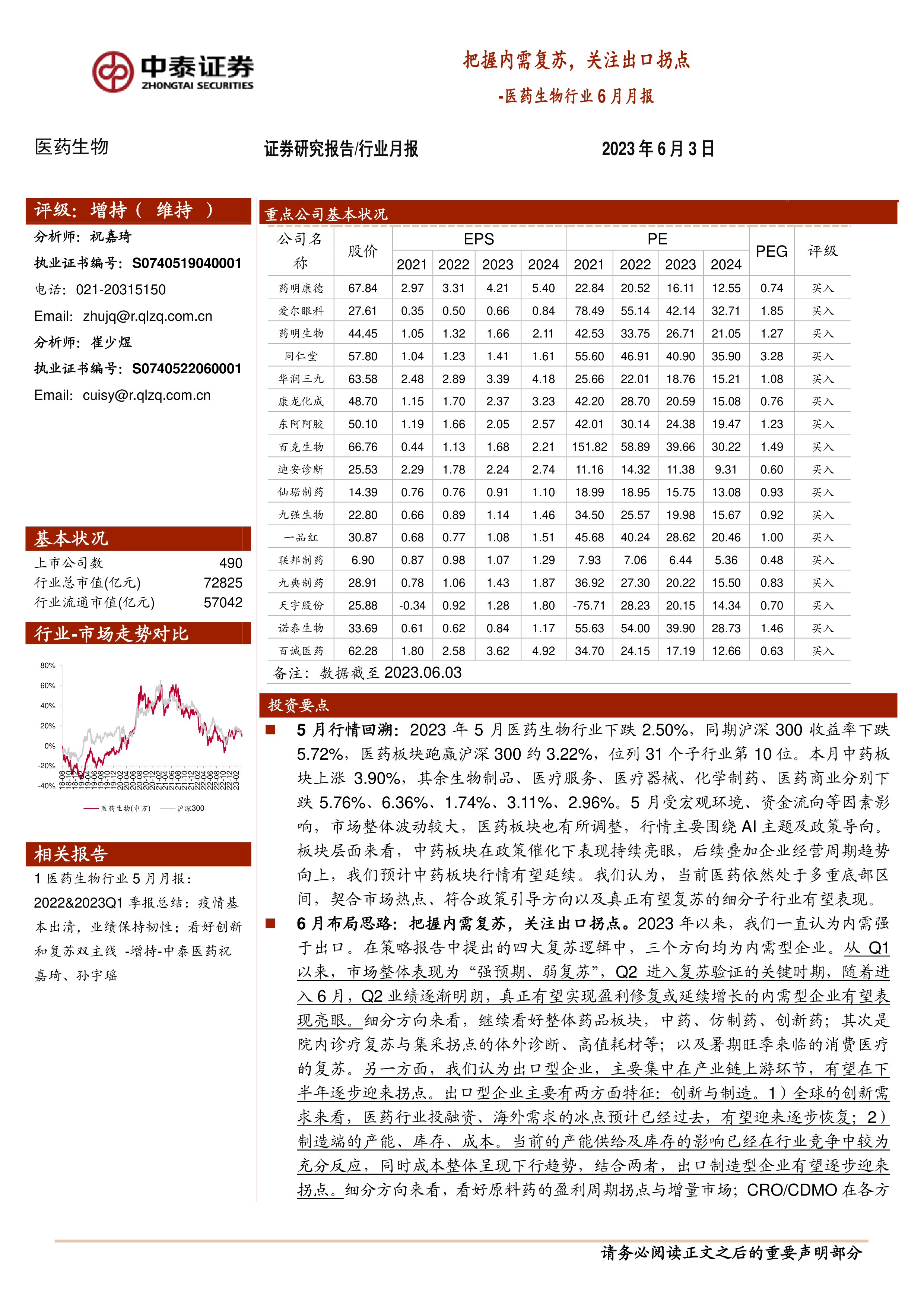 医药生物行业6月月报:把握内需复苏,关注出口拐点