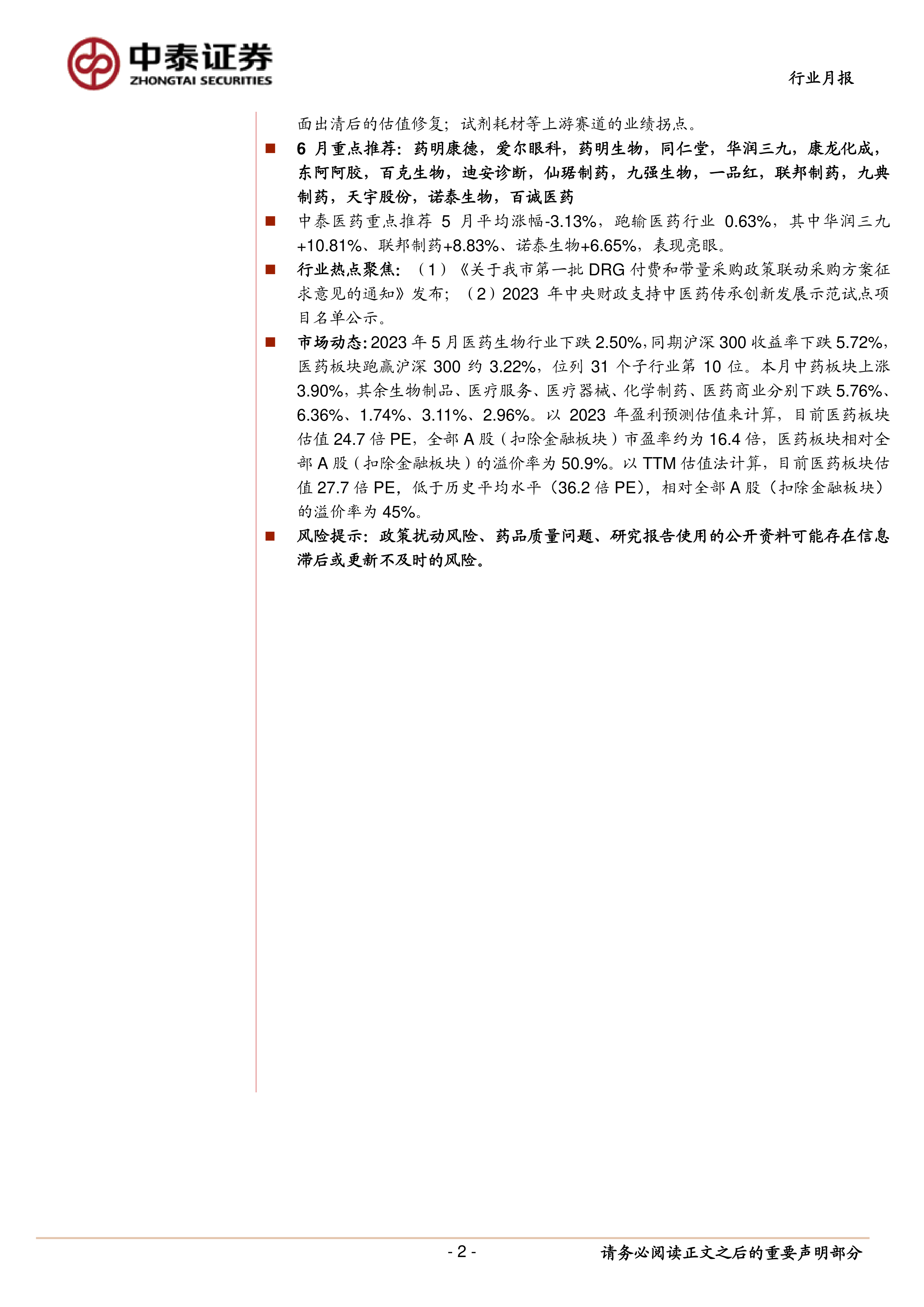 报告关注了两个行业热点:(1)北京市发布的DRG付费和带量采购政策联动采购方案,认为该方案将强化龙头企业的竞争优势;(2)2023年中央财政支持中医药传承创新发展示范试点项目名单公示,认为中药板块进入政策红利密集释放期,看好全年板块性机会。报告还提供了5月份医药生物行业及子行业的涨跌幅数据,以及医药板块的估值情况,指出医药板块估值相对全部A股存在溢价,但低于历史平均水平。