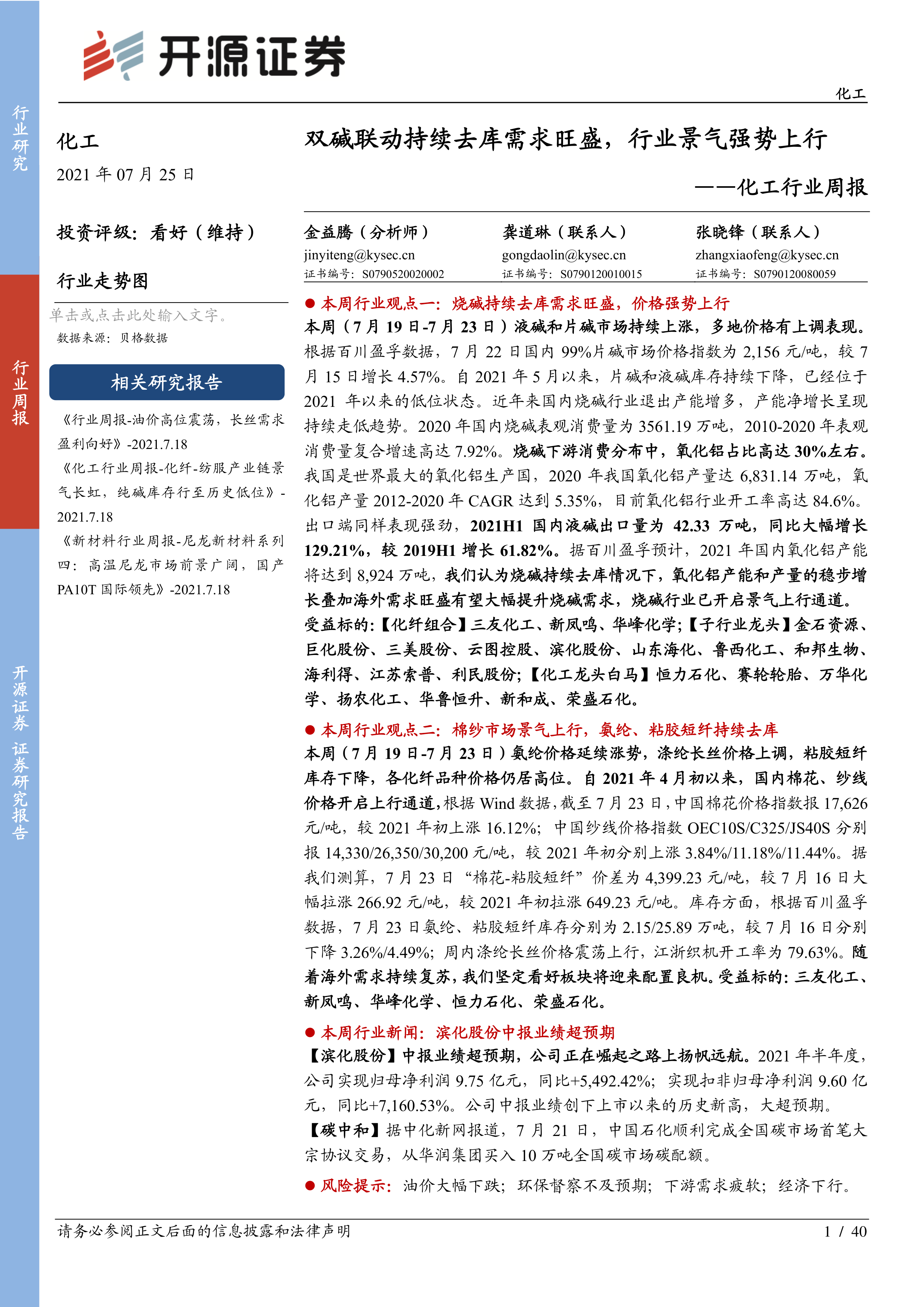 本周化工行业指数跑赢沪深300指数1.65%,CCPI上涨3.82%。化工品价格涨跌互现,其中烧碱持续去库,价格强势上行,主要原因是供给收缩和需求向好;化纤行业棉纱市场景气上行,氨纶、粘胶短纤持续去库,价格维持高位。报告还点评了滨化股份中报业绩超预期以及中国石化完成全国碳市场首笔大宗协议交易两条行业新闻。
