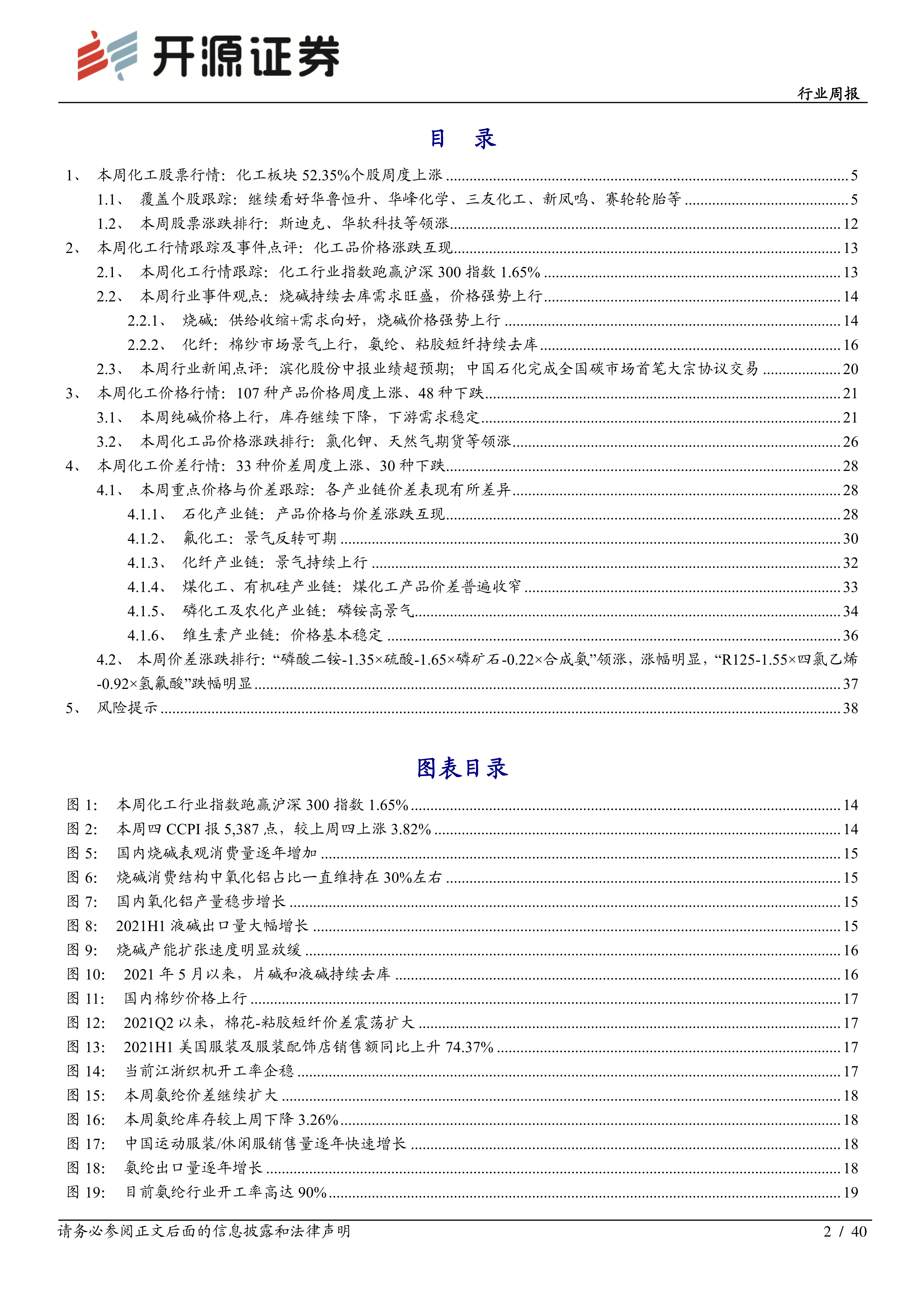 本报告为化工行业周报,涵盖了本周化工股票行情、化工行情跟踪及事件点评、化工价格行情、化工价差行情以及风险提示等方面的内容。