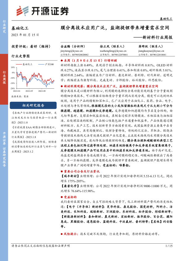 新材料行业周报:膜分离技术应用广泛,盐湖提锂带来增量需求空间