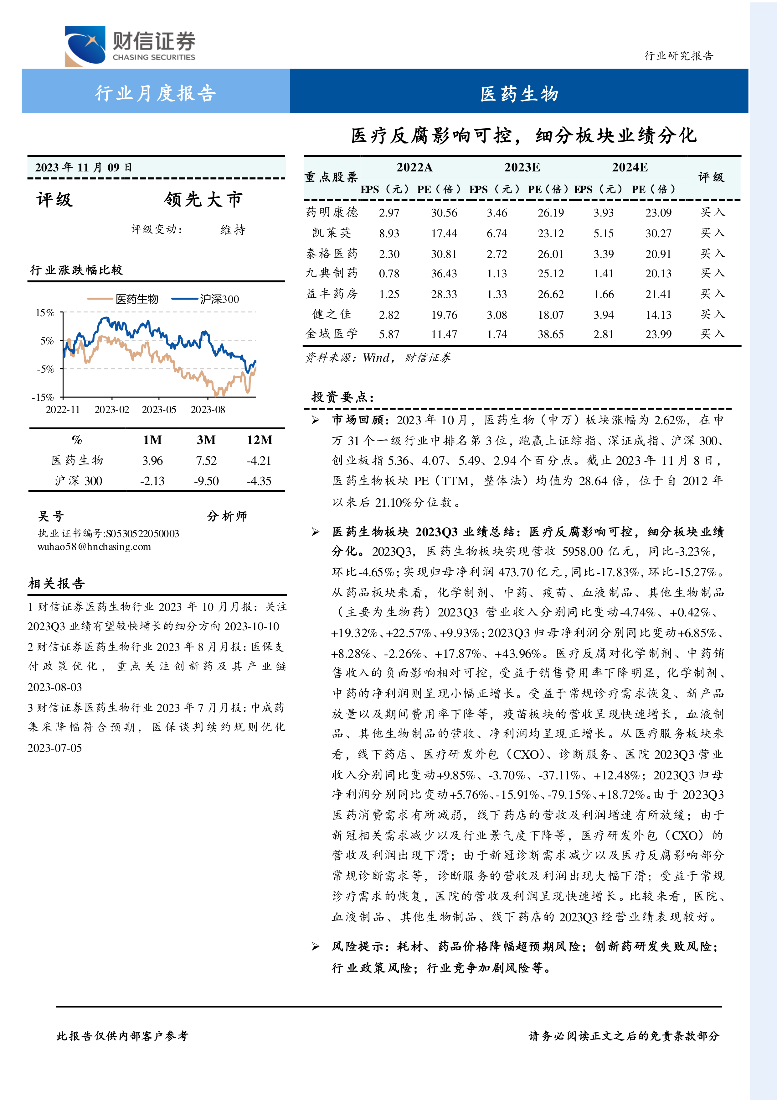 本报告对2023年三季度医药生物板块的市场表现、业绩情况、估值水平以及行业重要新闻进行了全面分析。报告指出,医疗反腐的影响在可控范围内,但细分板块业绩分化明显。部分细分领域表现良好,部分领域受到较大冲击。目前板块估值处于历史低位,政策边际向好,长期发展空间广阔。报告最后给出了具体的投资建议,建议关注特定投资方向,并提示了潜在的投资风险。 报告数据主要来源于Wind和财信证券。