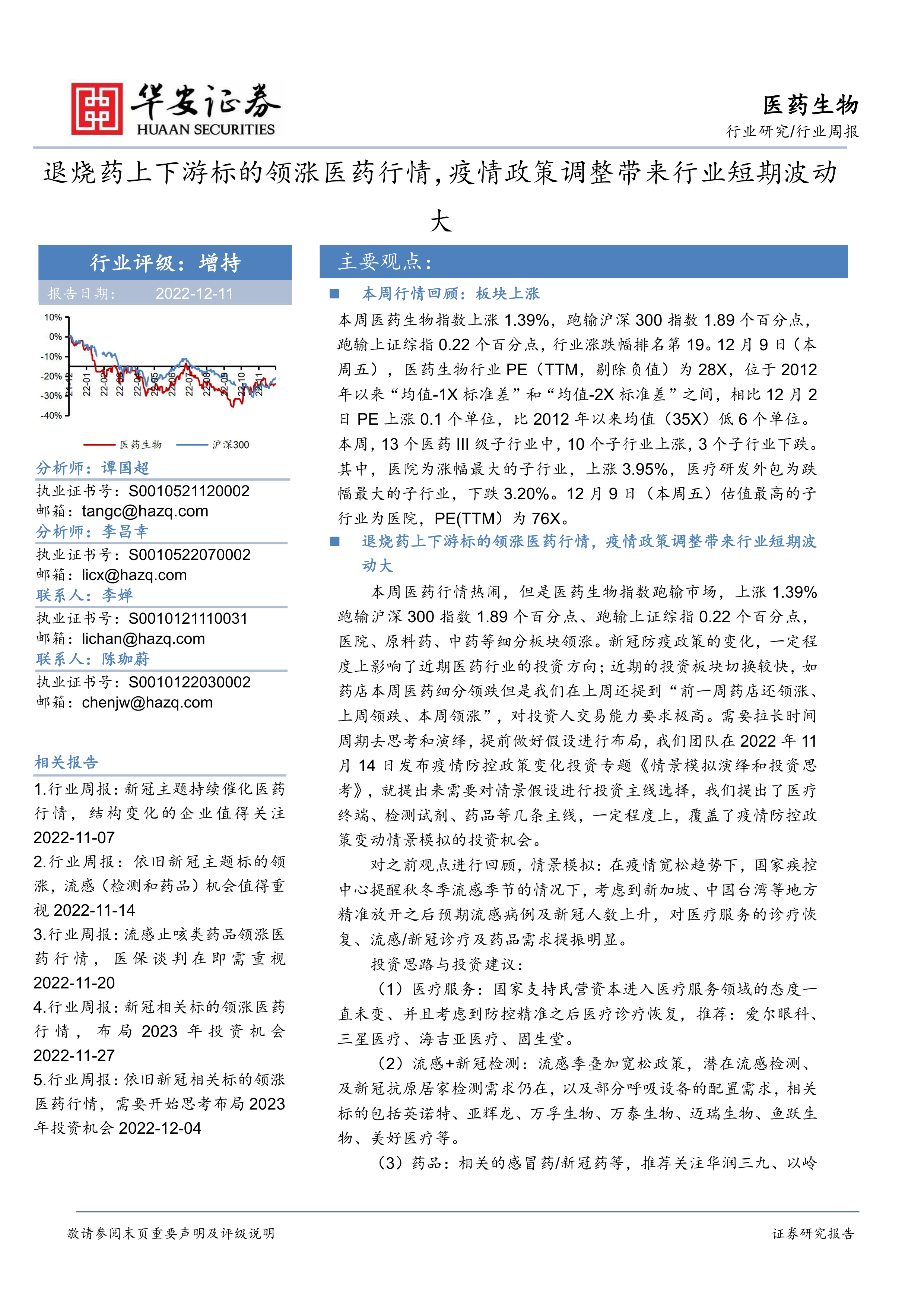 医药生物行业周报:退烧药上下游标的领涨医药行情,疫情政策调整带来行业短期波动大