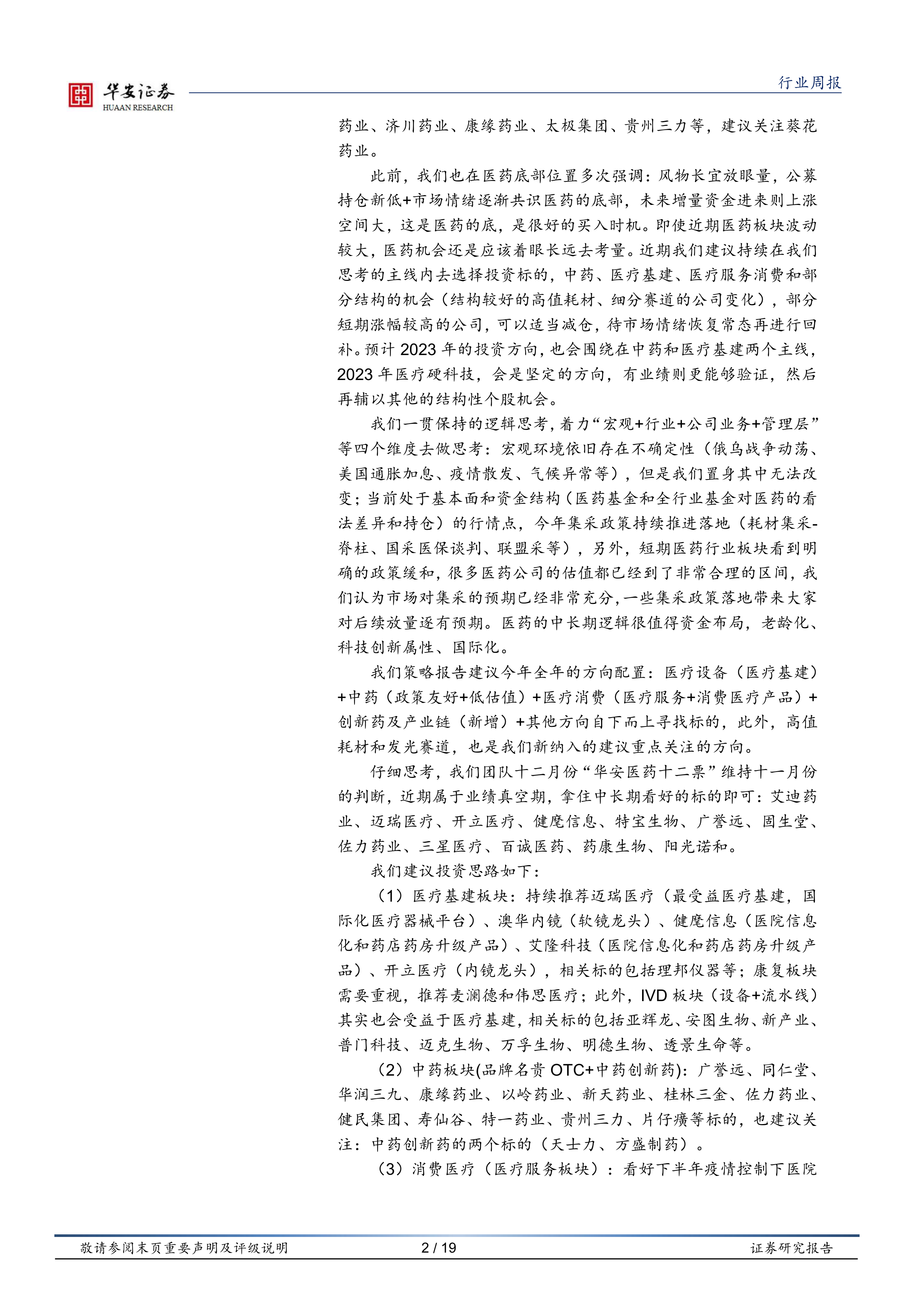 报告强调长期投资视角,建议持续关注中药、医疗基建、医疗服务消费和部分结构性机会(例如结构较好的高值耗材、细分赛道公司)。 对于短期涨幅较高的公司,建议适当减仓,待市场情绪恢复后再进行回补。 报告预测2023年投资方向将围绕中药和医疗基建两大主线展开,并看好医疗硬科技领域的长期发展。