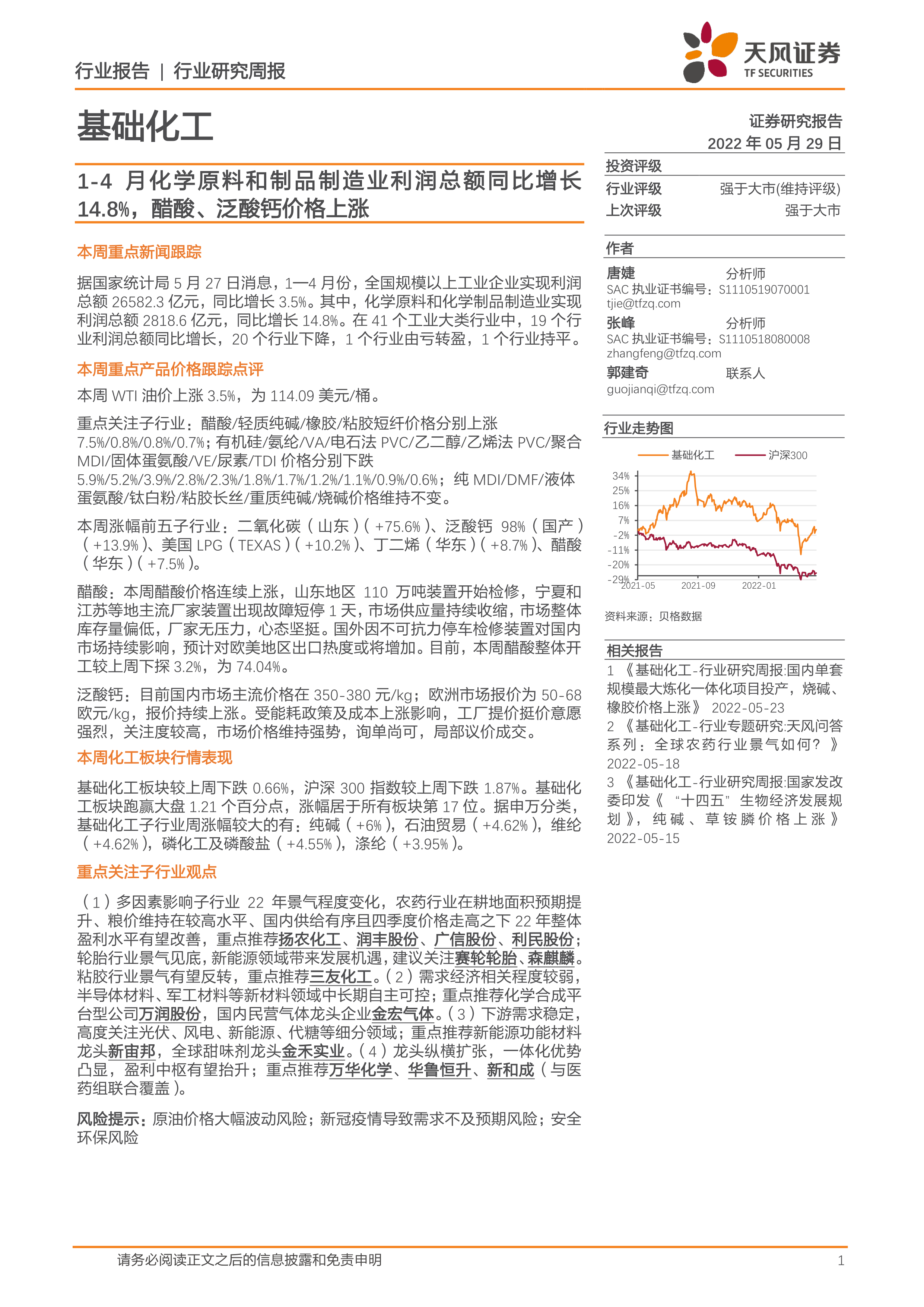 基础化工行业研究周报:1-4月化学原料和制品制造业利润总额同比增长14.8%,醋酸、泛酸钙价格上涨