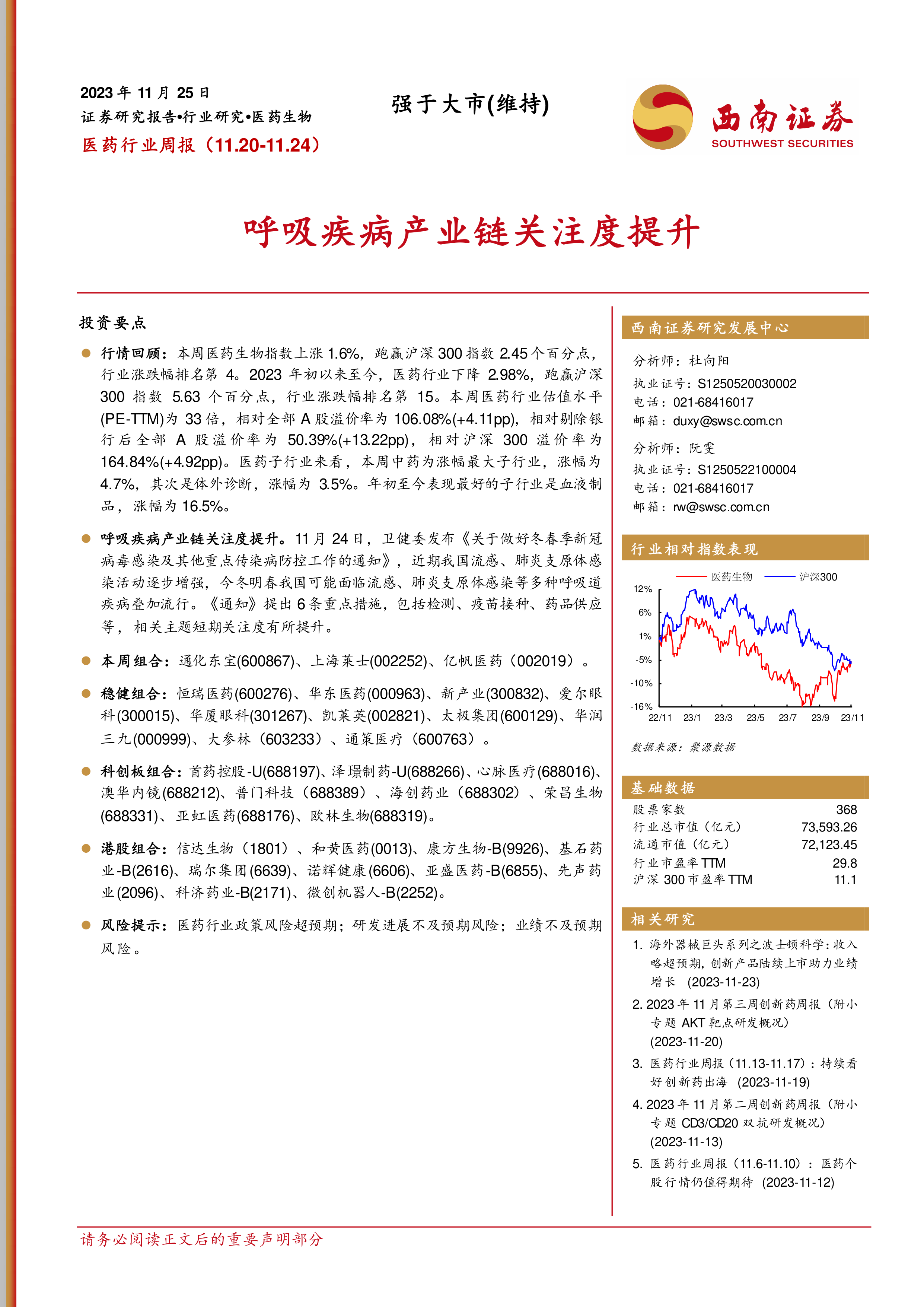 本报告对医药行业本周的市场表现进行了全面的分析,数据显示医药行业整体表现强劲,跑赢大盘,且呼吸道疾病防控政策的出台为相关产业链带来了短期利好。报告详细分析了行业估值、资金流向、个股表现以及最新的行业新闻和政策,并提供了丰富的研究报告目录,为投资者提供了较为全面的市场信息和投资参考。 需要注意的是,报告中提到的投资建议仅供参考,投资者应根据自身情况进行独立判断,并承担相应的投资风险。