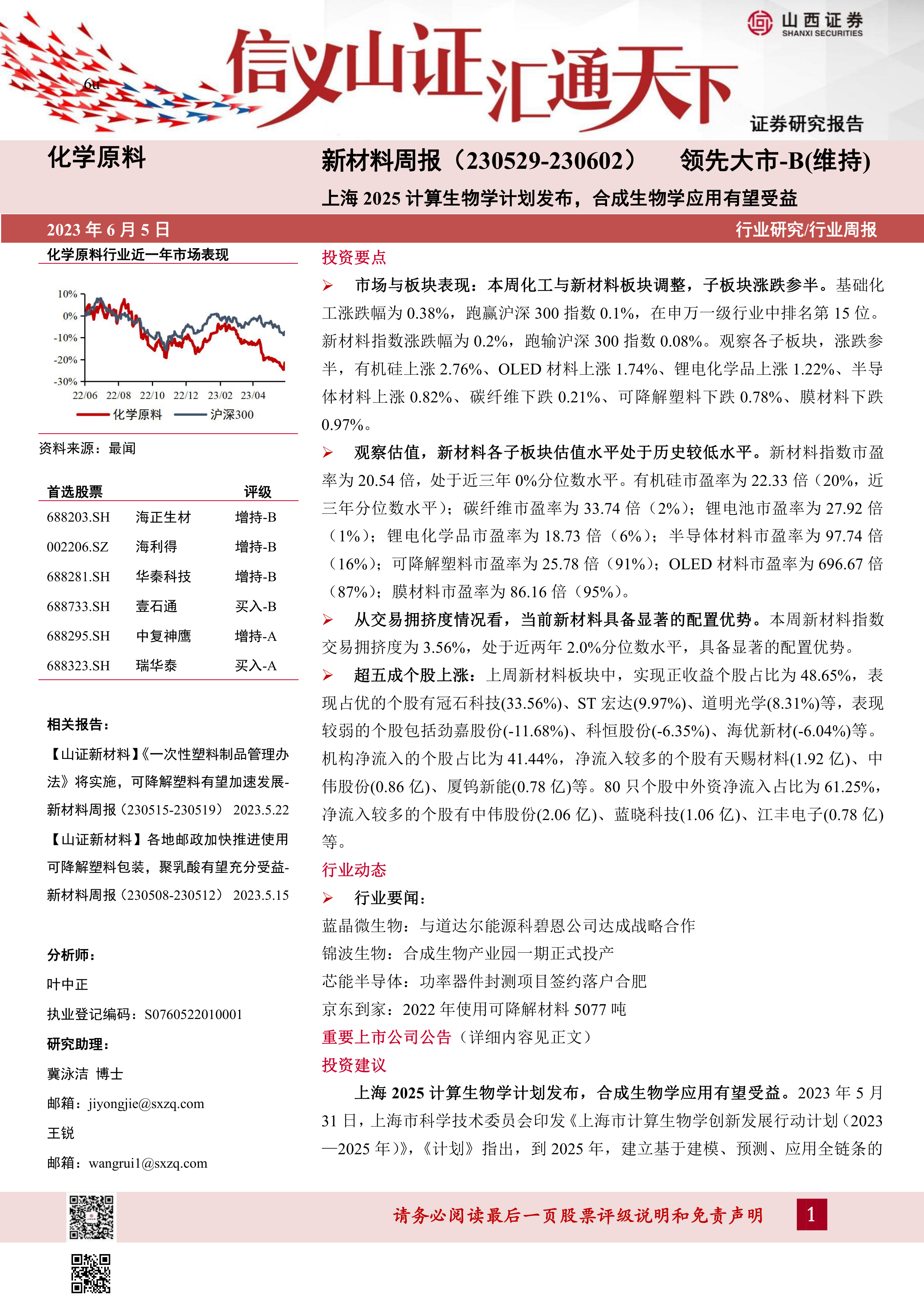 报告从长期和短期两个维度分析了新材料行业的投资机会。长期来看,新材料行业发展前景广阔,投资逻辑清晰;短期内,上海2025计算生物学计划的发布为合成生物学应用带来利好,值得关注。