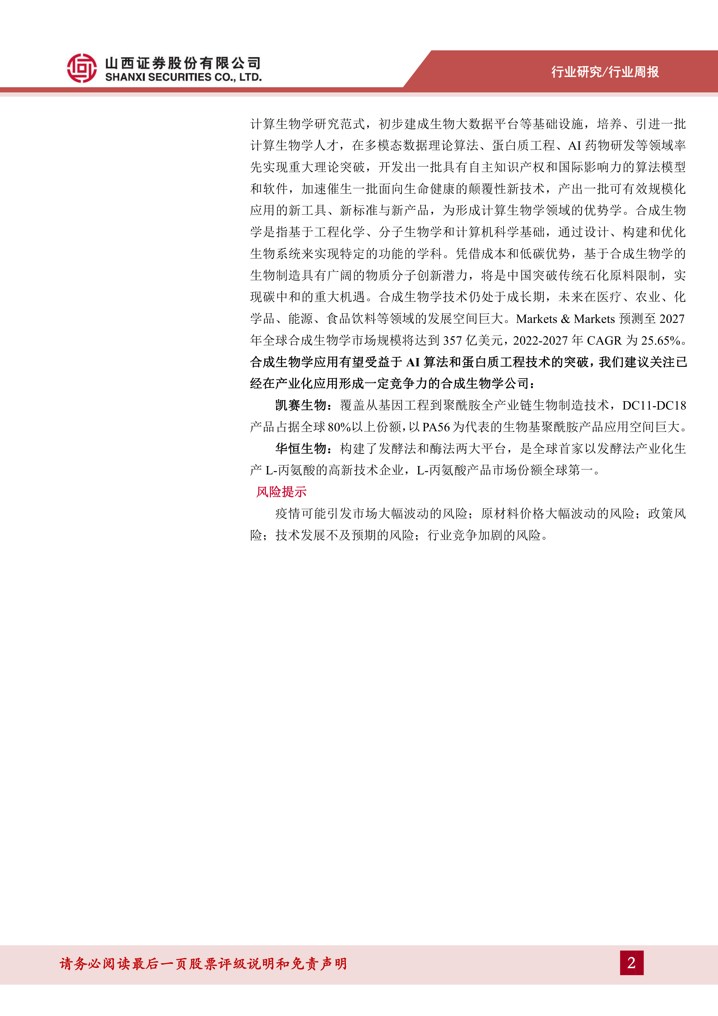 上海2025计算生物学计划发布,合成生物学应用有望受益。2023年5月31日,上海市科学技术委员会印发《上海市计算生物学创新发展行动计划(2023—2025年)》,《计划》指出,到2025年,建立基于建模、预测、应用全链条的计算生物学研究范式,初步建成生物大数据平台等基础设施,培养、引进一批计算生物学人才,在多模态数据理论算法、蛋白质工程、AI药物研发等领域率先实现重大理论突破,开发出一批具有自主知识产权和国际影响力的算法模型和软件,加速催生一批面向生命健康的颠覆性新技术,产出一批可有效规模化应用的新工具、新标准与新产品,为形成计算生物学领域的优势学。合成生物学是指基于工程化学、分子生物学和计算机科学基础,通过设计、构建和优化生物系统来实现特定的功能的学科。凭借成本和低碳优势,基于合成生物学的生物制造具有广阔的物质分子创新潜力,将是中国突破传统石化原料限制,实现碳中和的重大机遇。合成生物学技术仍处于成长期,未来在医疗、农业、化学品、能源、食品饮料等领域的发展空间巨大。Markets&Markets预测至2027年全球合成生物学市场规模将达到357亿美元,2022-2027年CAGR为25.65%。合成生物学应用有望受益于AI算法和蛋白质工程技术的突破,我们建议关注已经在产业化应用形成一定竞争力的合成生物学公司: