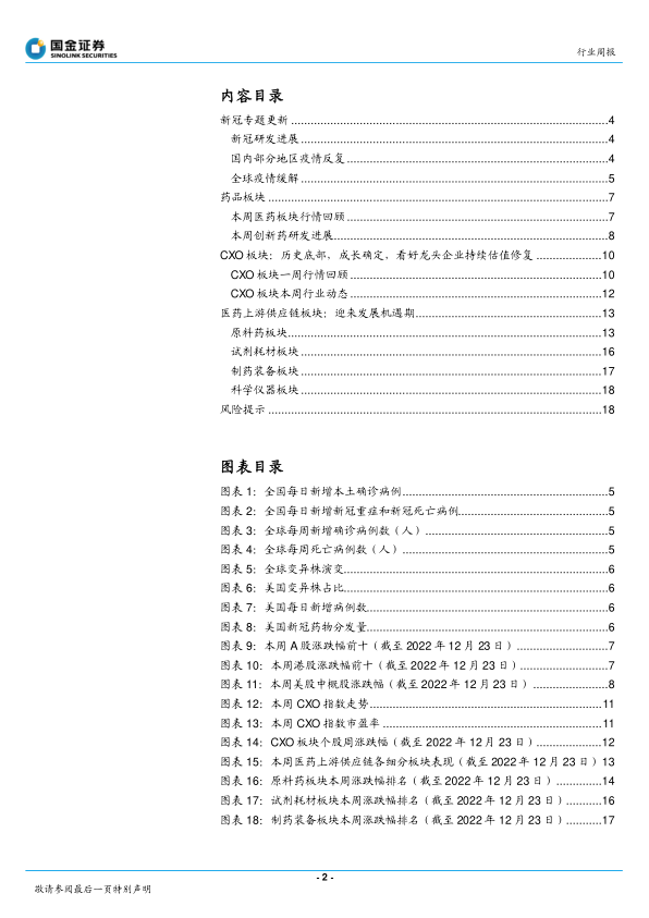 本报告的核心观点是:在疫情防控常态化发展的大背景下,医药行业呈现出“修复与创新双主线”的态势。一方面,疫情防控政策的调整将推动药品板块的复苏,龙头药企估值有望修复;另一方面,创新药研发持续推进,CXO板块作为行业重点方向,业绩韧性强,成长确定性高。此外,医药上游供应链板块也迎来发展机遇期,国产替代加速进程。