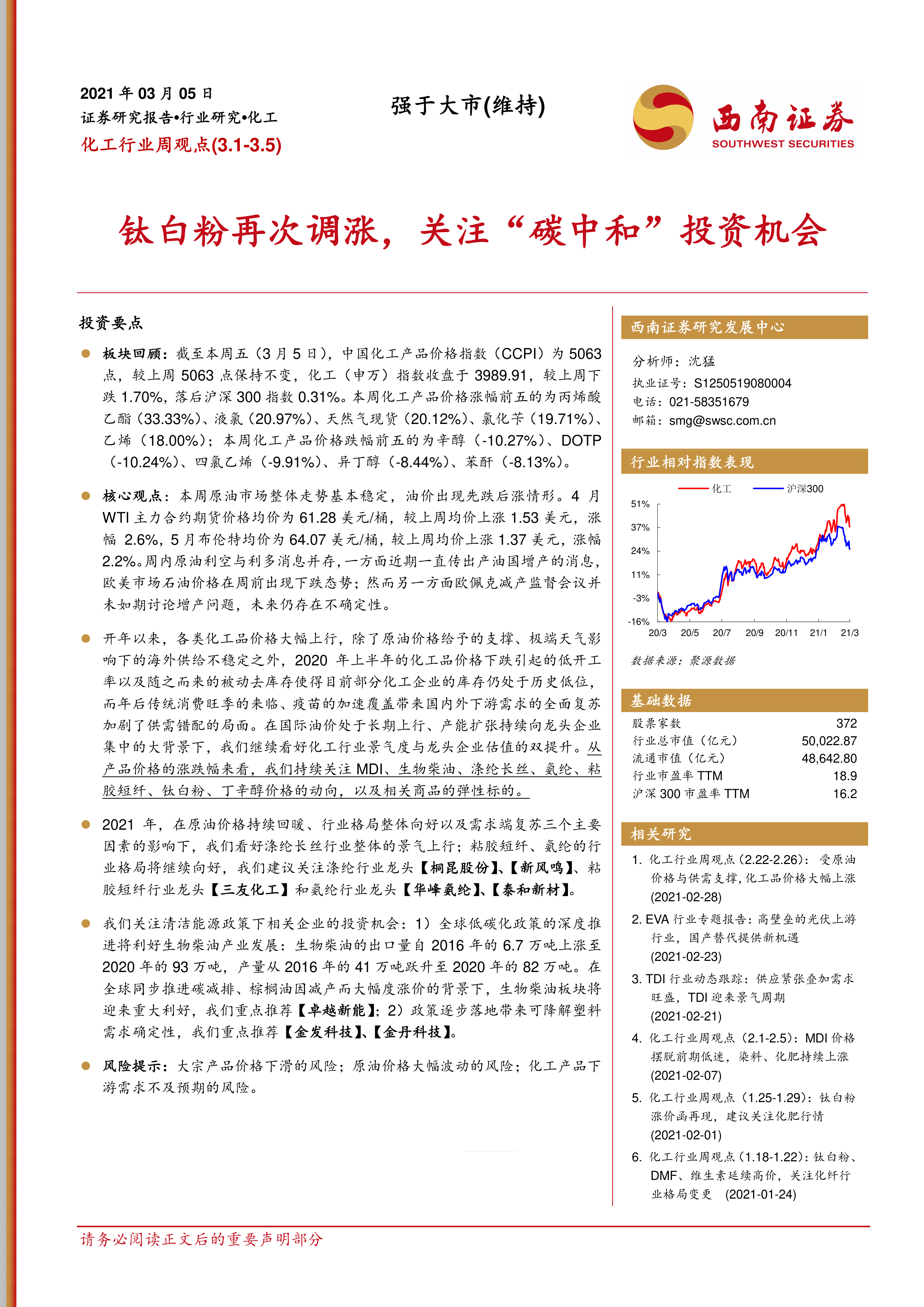 化工行业周观点:钛白粉再次调涨,关注“碳中和”投资机会