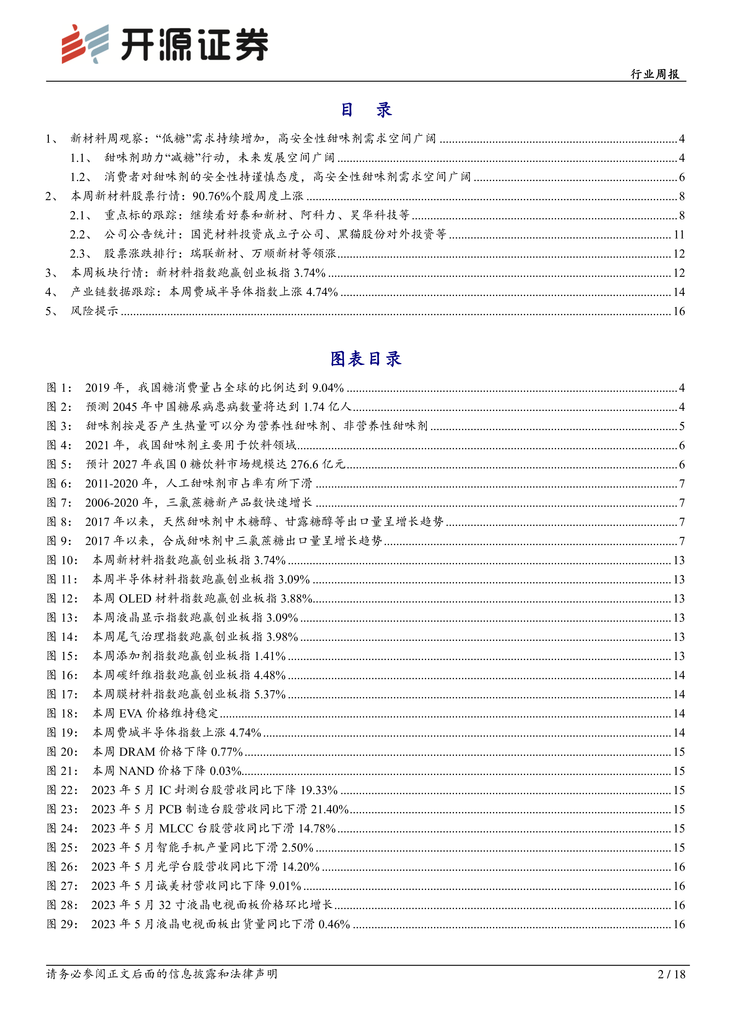 本报告分析了我国“减糖”趋势下高安全性甜味剂市场广阔的发展前景,并对相关企业进行了投资建议。同时,报告还对本周新材料行业整体市场表现、重点公司动态以及产业链数据进行了跟踪分析,为投资者提供参考信息。 需要注意的是,投资存在风险,投资者应谨慎决策。