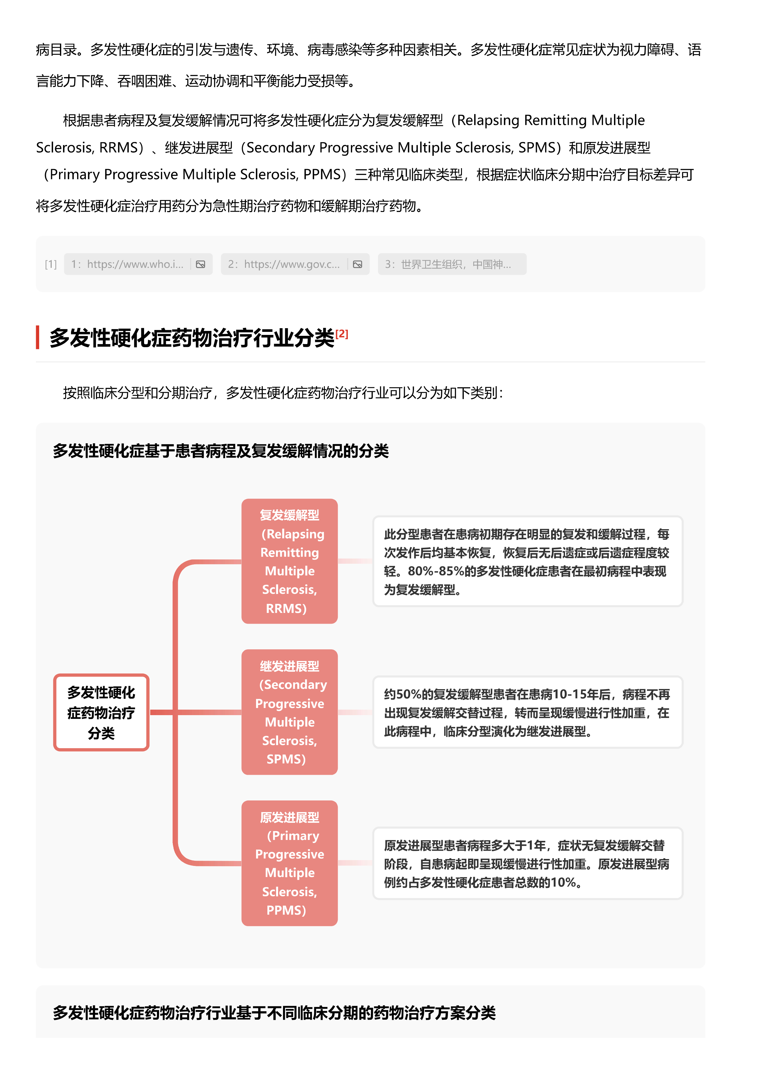 多发性硬化症凭借每年10万人中新发病例不足1人,于2018年由国家卫健委等多部门列入空见病目录,加之其病灶深植神经中极难以直观发现的惠病特点,中国多发性硬化症治疗用药当前仍存在较大需求缺口。对于各病情分型中最为多见的复发缓解型患者,疾病修正治疗(Disease-ModifyingTherapy,DMT)药物为当前临床治疗前沿用药,中国已上市DMT药物品类较少,驱需本土企业加大研发创新力度以突破思者治疗困境。DMT药物中单克降抗体药物因前期研发投入体量大,降价空间不足,面临集采覆盖难题,惠者接受靴向治疗仍存在高成本负压。与此同时干扰素α大品类集采为多发性硬化症对症治疗用干扰素B可及性提升提供可能性。竞争格局层面,多种药品市场的主要份额仍由海外品牌占据,DMT口服药物仅有少数本土仿制药上市,单抗注射药物暂未开始国产化进程,中国多发性硬化症药物治疗行业发展可期。本报告将从多发性硬化症引发机制、对用药物治疗分型、药物治疗行业发展沿革、产业链现状总览、市场规模驱动因素和参与玩家竞争格局等角度对多发性硬化症药物治疗行业进行深入探索。