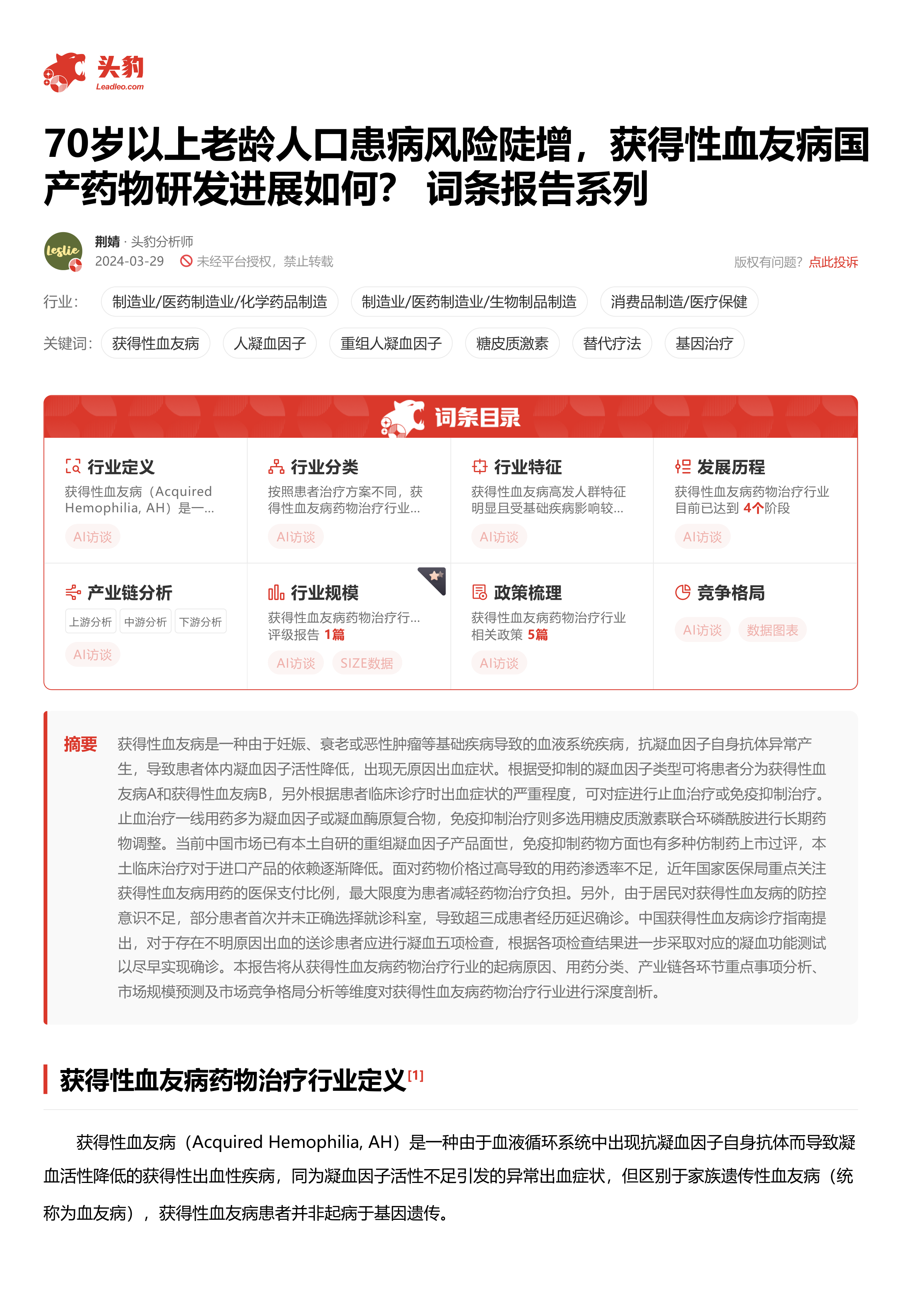 70岁以上老龄人口患病风险陡增,获得性血友病国产药物研发进展如何? 词条报告系列