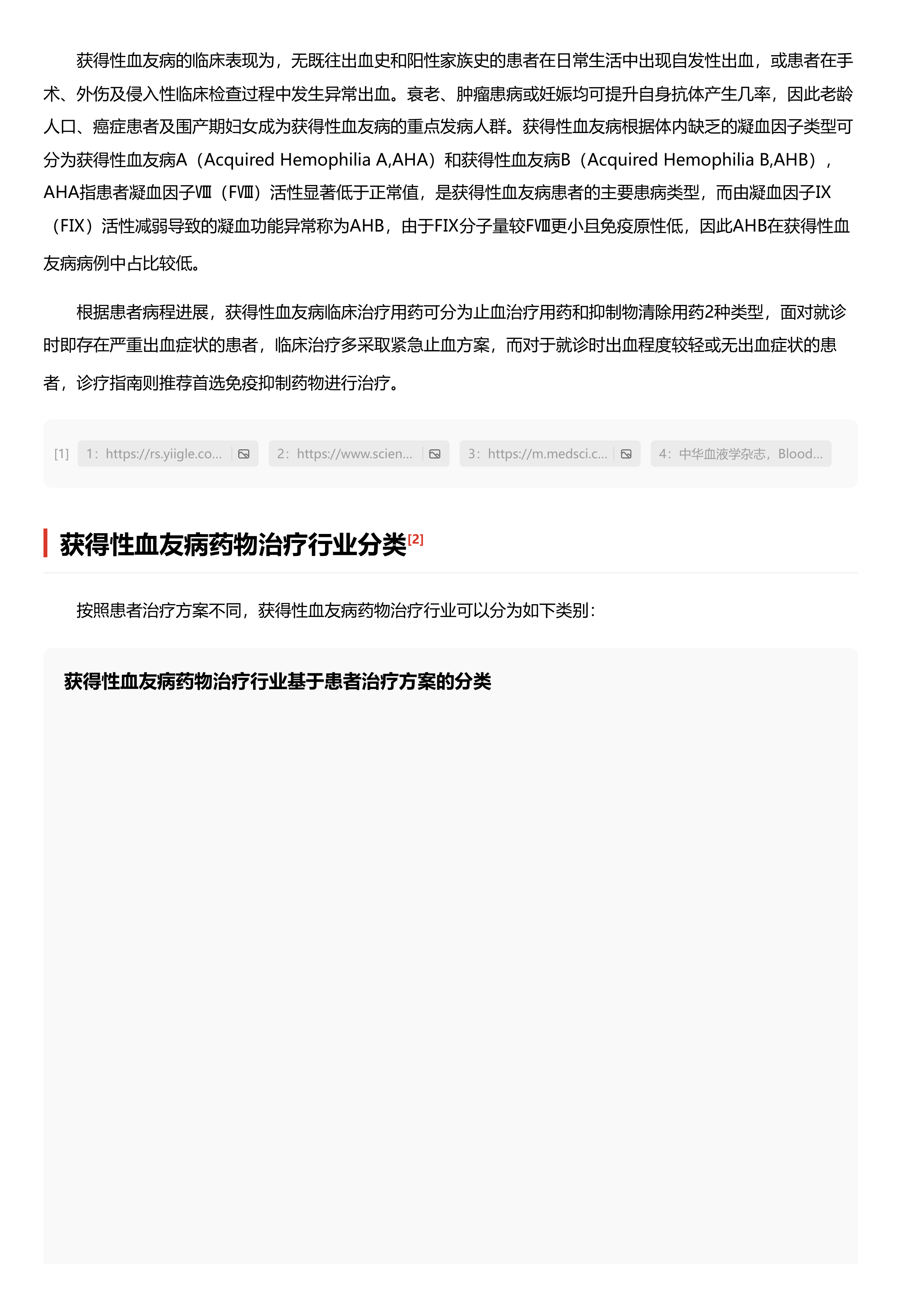 本节介绍了获得性血友病(AH)的定义、临床表现、分类(A型和B型)以及治疗方案(止血治疗和免疫抑制治疗)。 报告指出,AH的发生与妊娠、衰老、恶性肿瘤等基础疾病密切相关,高发人群集中在育龄女性和老年人。 治疗药物主要包括凝血因子制品(人凝血因子、重组凝血因子)、活化凝血酶原复合物(APCC)、糖皮质激素、环磷酰胺等免疫抑制剂。 目前中国市场已有国产重组凝血因子产品上市,降低了对进口产品的依赖。