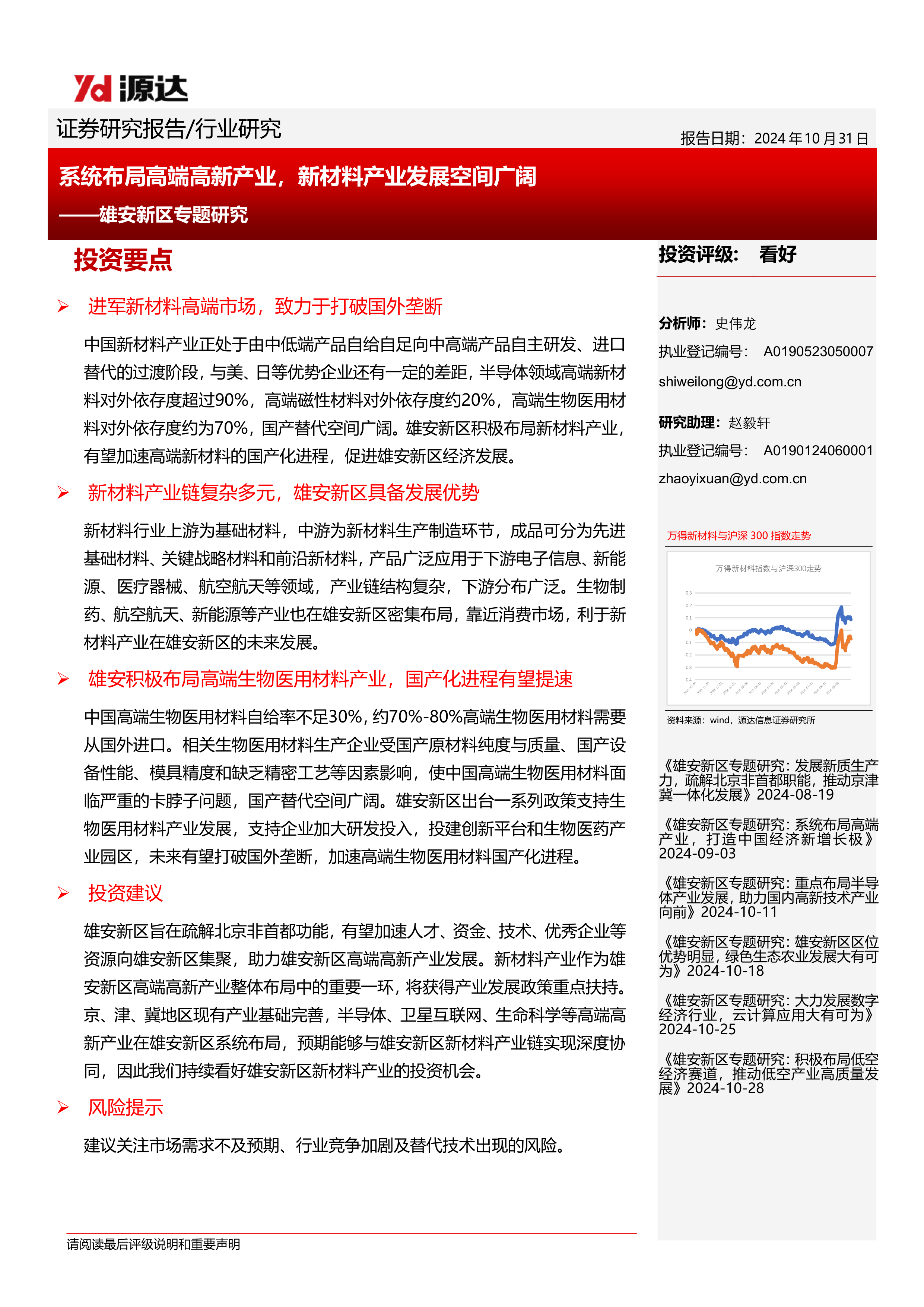 本报告通过对雄安新区产业规划、政策支持、产业协同以及市场需求的分析,论证了雄安新区新材料产业发展空间广阔的观点。 雄安新区在新能源、半导体和生物医用材料等领域积极布局,并出台一系列支持政策,有望打破国外垄断,实现高端新材料产业自主可控,促进区域经济高质量发展。 报告也指出了市场需求不及预期、行业竞争加剧以及替代技术出现等潜在风险。 总体而言,报告对雄安新区新材料产业的未来发展持乐观态度,并建议持续关注该领域的投资机会。