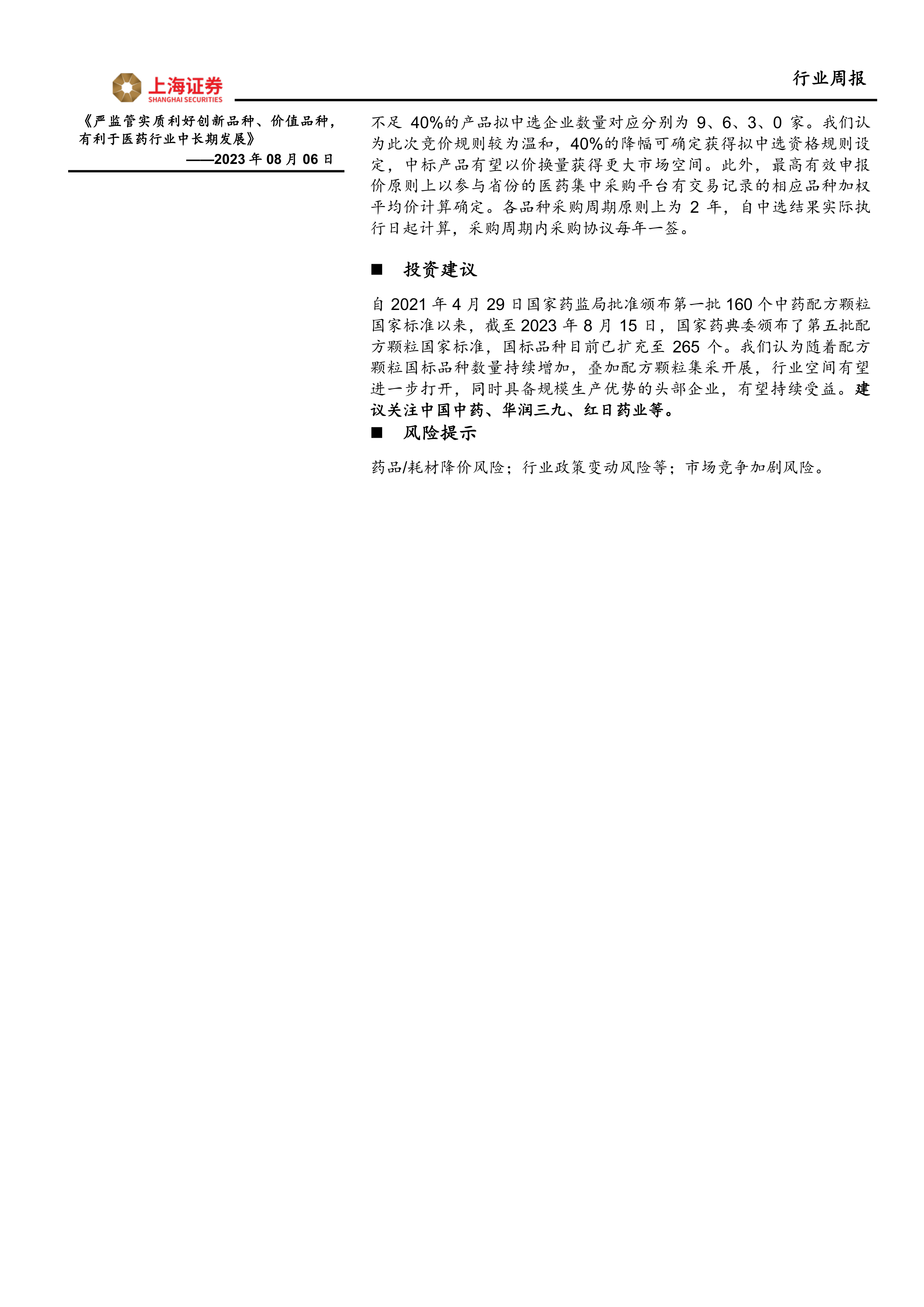 自2021年4月29日国家药监局批准颁布第一批160个中药配方颗粒国家标准以来,截至2023年8月15日,国家药典委颁布了第五批配方颗粒国家标准,国标品种目前已扩充至265个。我们认为随着配方颗粒国标品种数量持续增加,叠加配方颗粒集采开展,行业空间有望进一步打开,同时具备规模生产优势的头部企业,有望持续受益。建议关注中国中药、华润三九、红日药业等。