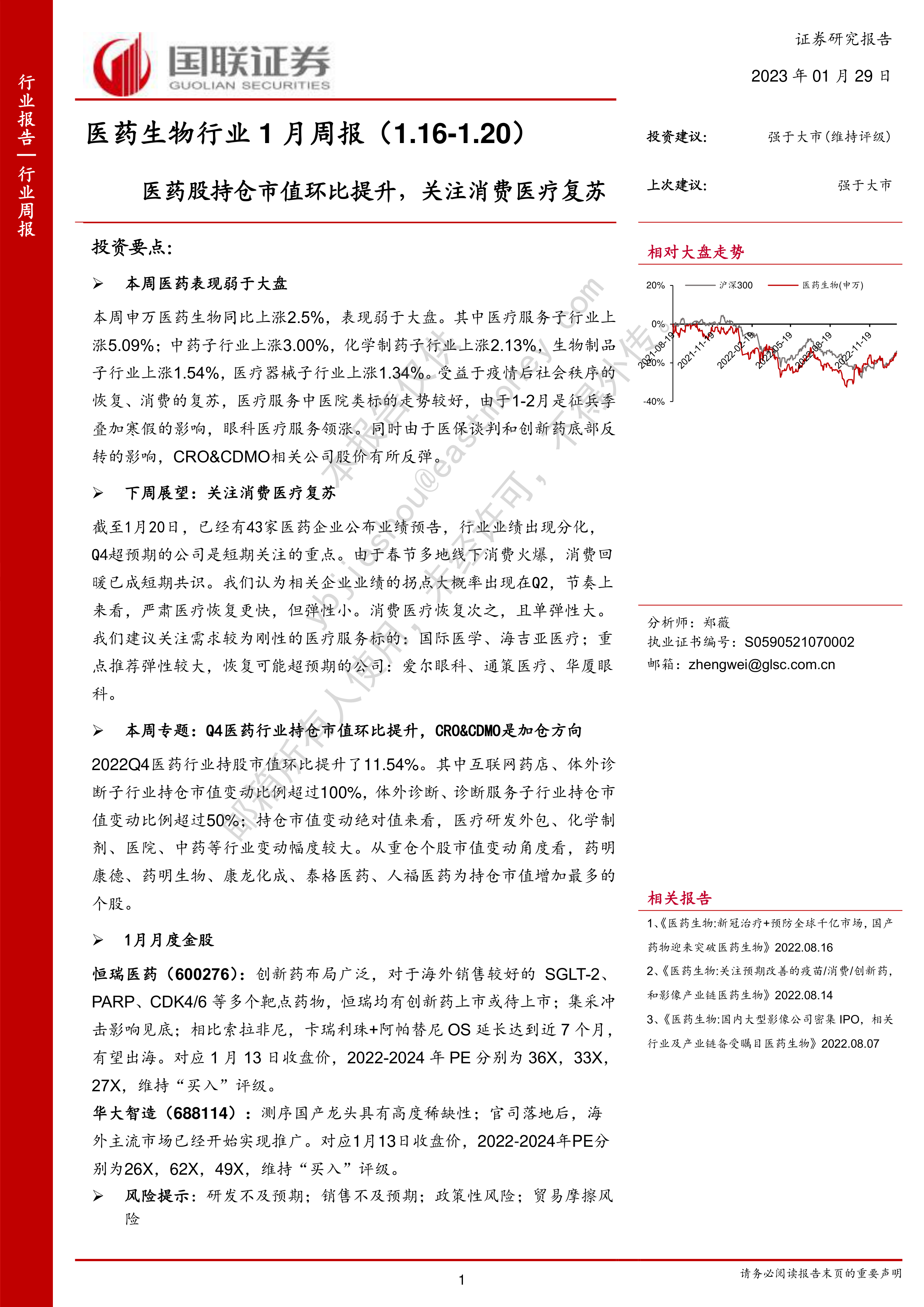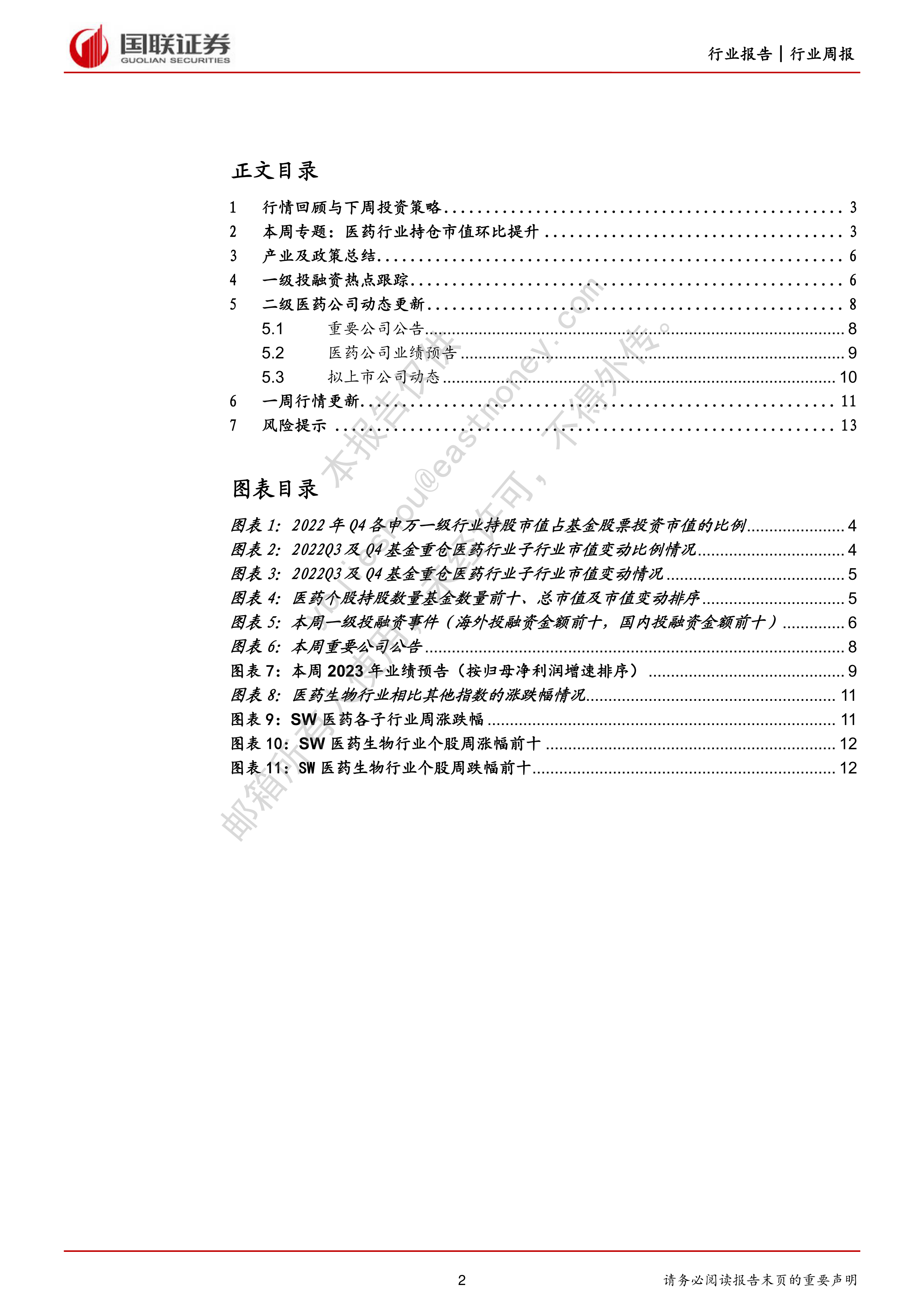 本报告的核心观点是:2022年Q4医药行业基金持仓市值环比提升显著,CRO&CDMO成为加仓重点方向;本周医药板块表现弱于大盘,但医疗服务(尤其眼科)和中药板块表现较好;消费医疗复苏预期增强,但业绩拐点预计出现在Q2;建议关注需求刚性的医疗服务和弹性较大的消费医疗标的。