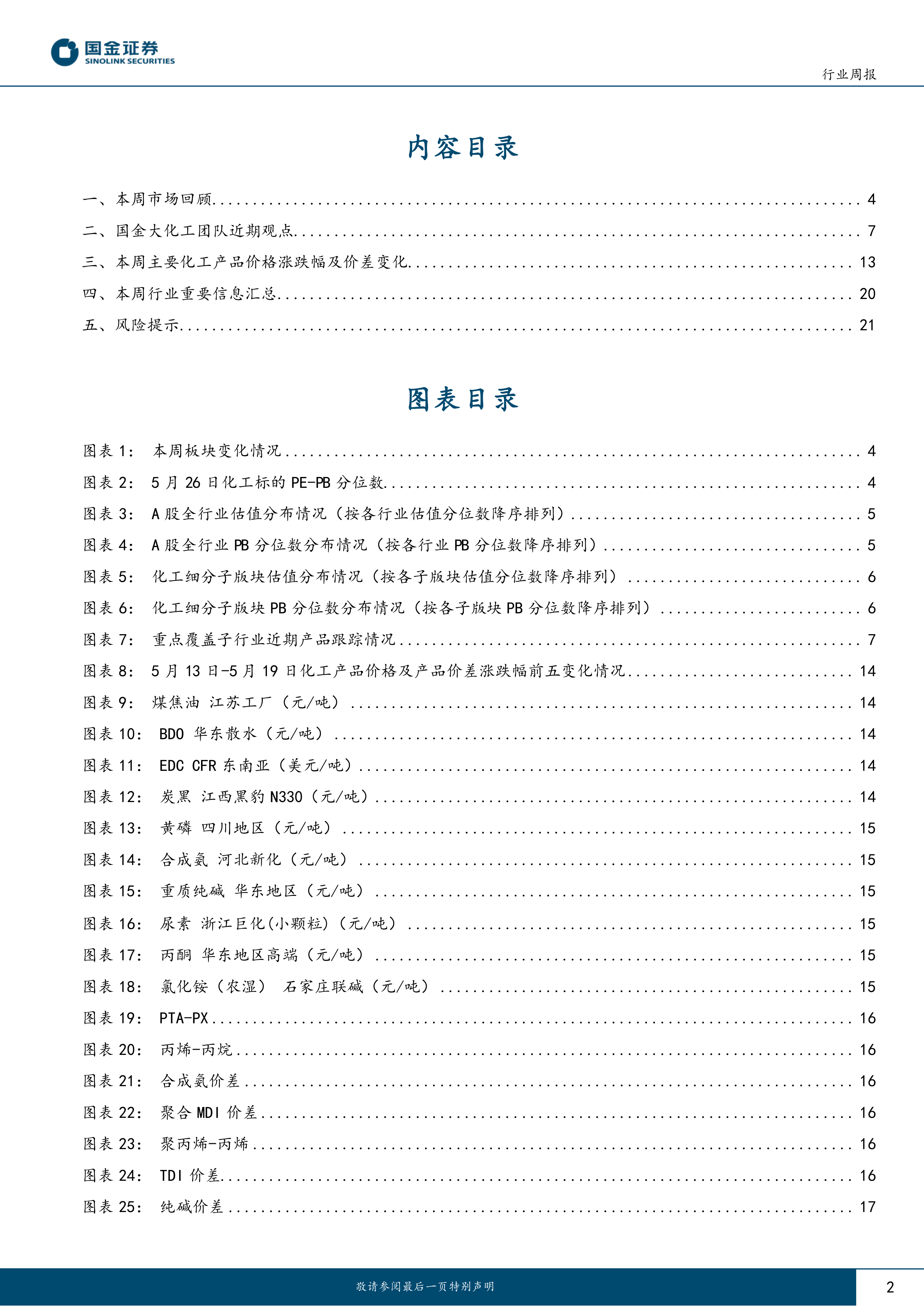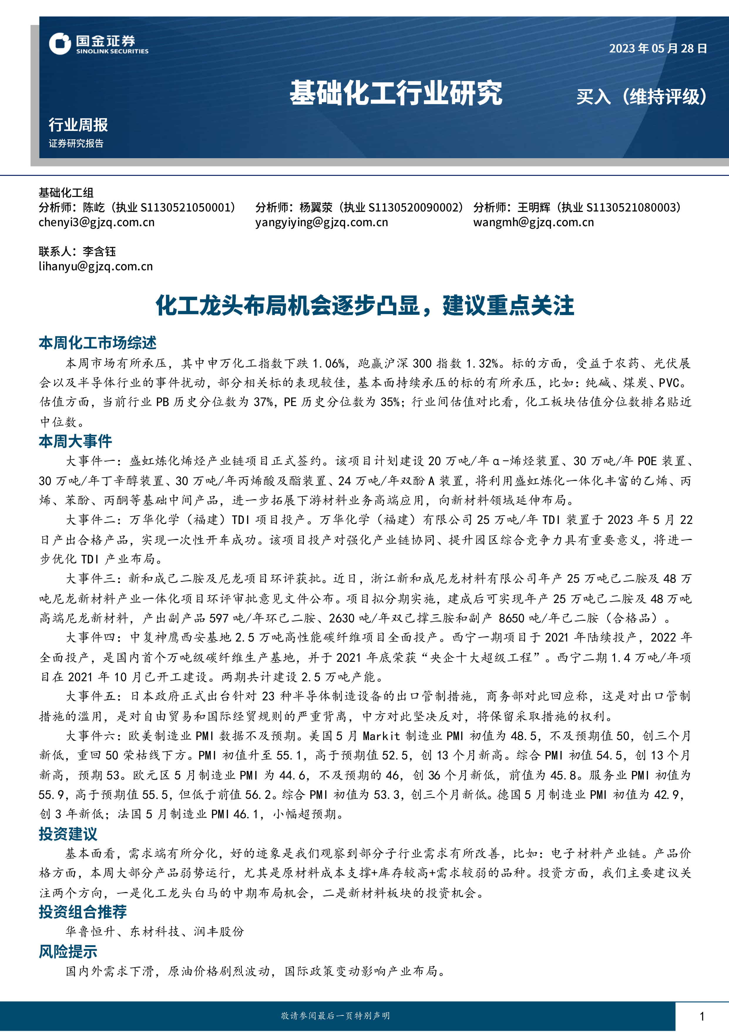 该部分总结了国金大化工团队近期对化工市场的观点,包括对市场走势的判断、投资建议以及风险提示。团队建议关注化工龙头白马的中期布局机会和新材料板块的投资机会。