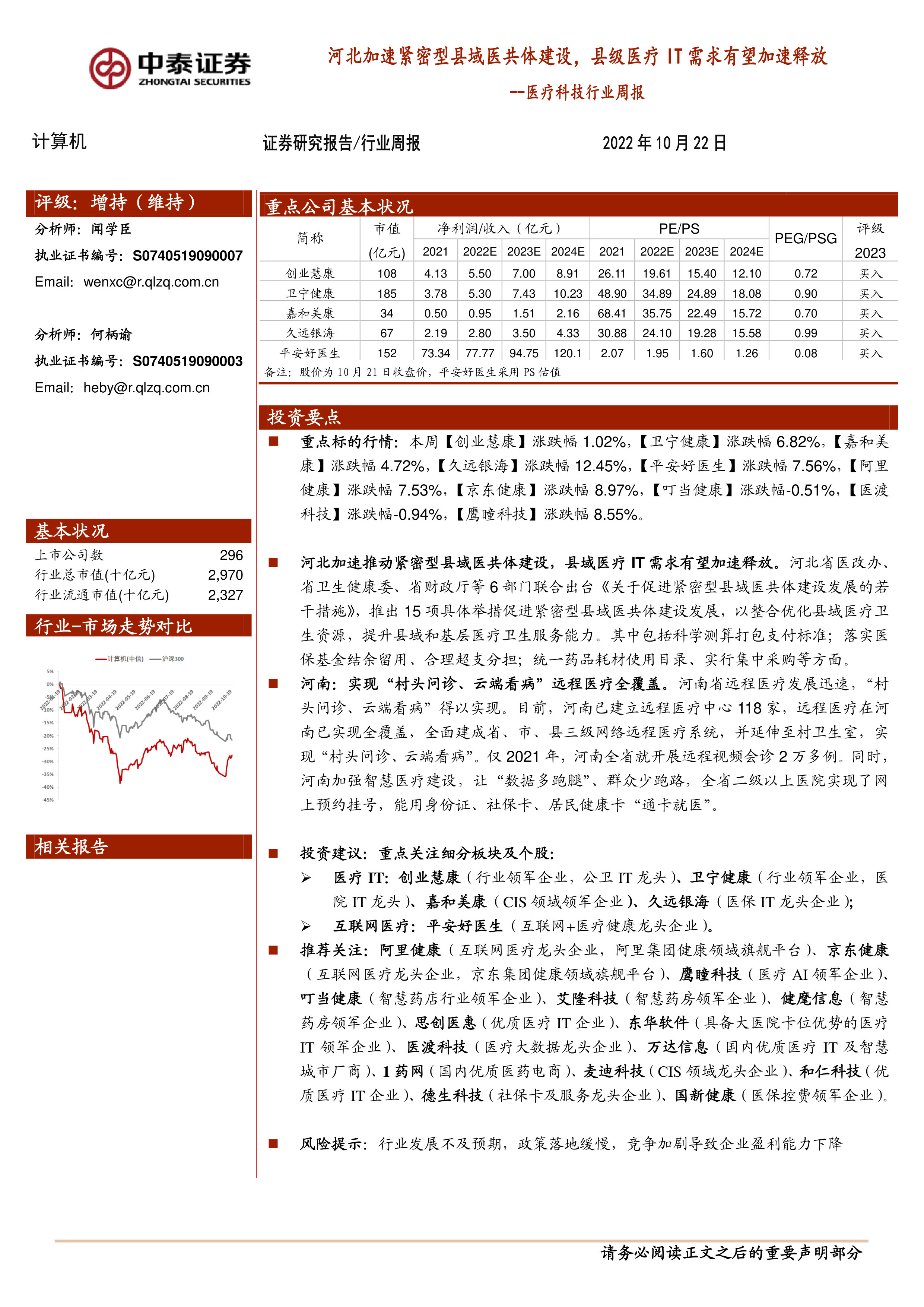 本报告通过对河北、河南两省医疗卫生政策的解读以及对医疗科技行业市场现状和发展趋势的分析,指出县域医疗IT需求有望加速释放,并为投资者提供了具体的投资建议和风险提示。报告认为,在政策支持和市场需求的共同驱动下,医疗IT和互联网医疗等细分板块将迎来新的发展机遇,但投资者仍需关注行业发展的不确定性因素。 报告中提到的个股评级和推荐,仅供参考,投资者应根据自身风险承受能力和投资目标做出独立判断。