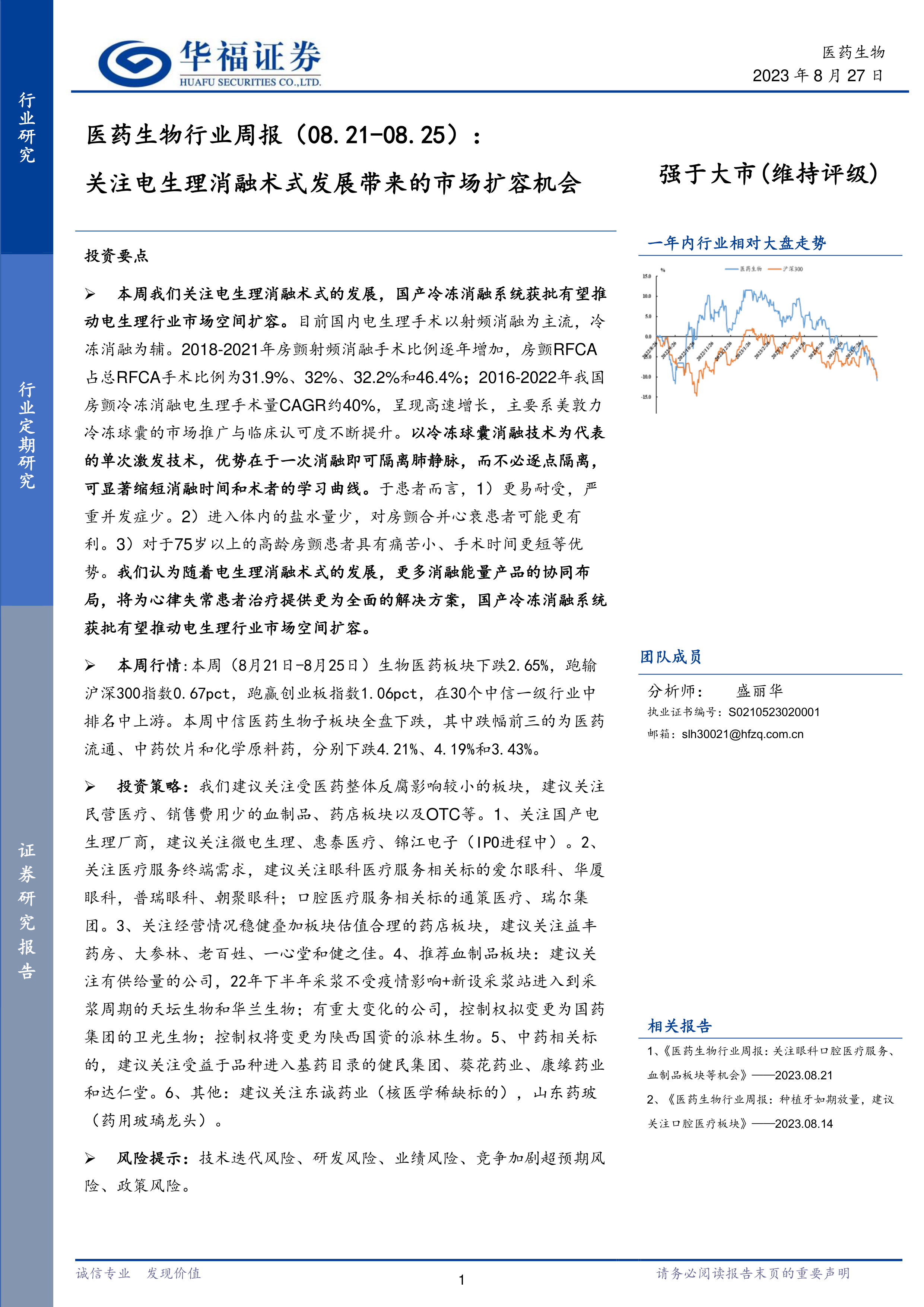 本报告的核心观点是:国产冷冻消融系统的获批将推动电生理行业市场空间扩容。报告通过数据分析,对比了射频消融和冷冻消融两种电生理消融术式的优劣,并指出冷冻消融技术,特别是单次激发技术(如冷冻球囊技术)的优势在于缩短手术时间、提高患者耐受性以及降低并发症发生率。 此外,报告还分析了本周医药市场行情,并给出相应的投资建议。