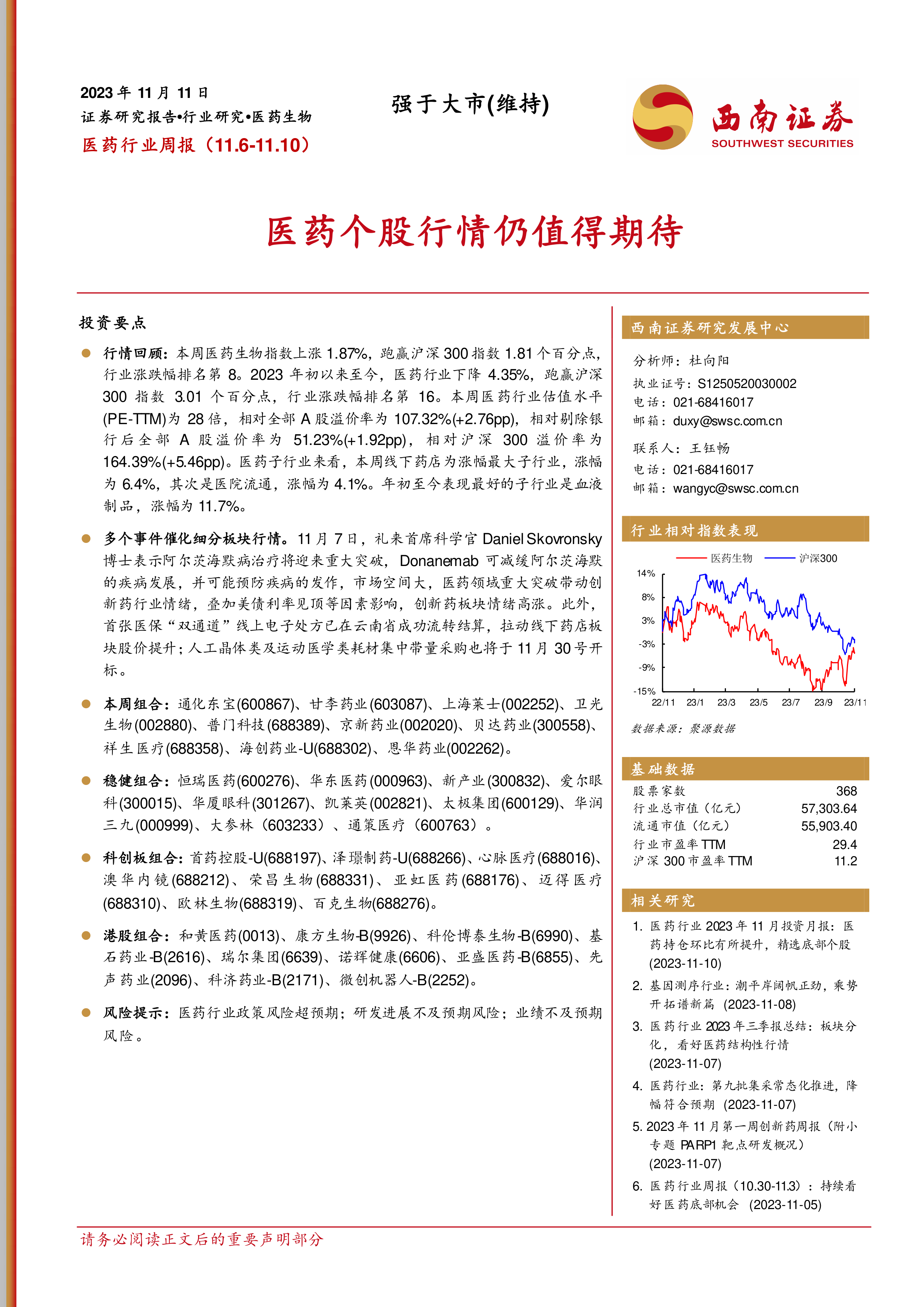 本报告对 2023年11月6日至10日一周的医药行业进行了全面分析。报告指出,医药行业本周表现强于大市,创新药板块受利好消息刺激,情绪高涨。然而,行业整体估值仍然较高,投资者需谨慎。报告提供了四个投资组合建议,并对相关个股进行了分析,同时提示了潜在的风险。 报告还涵盖了二级市场表现、最新新闻与政策以及相关研究报告,为投资者提供了较为全面的信息参考。 投资者需注意报告中提到的风险提示,并根据自身情况进行投资决策。