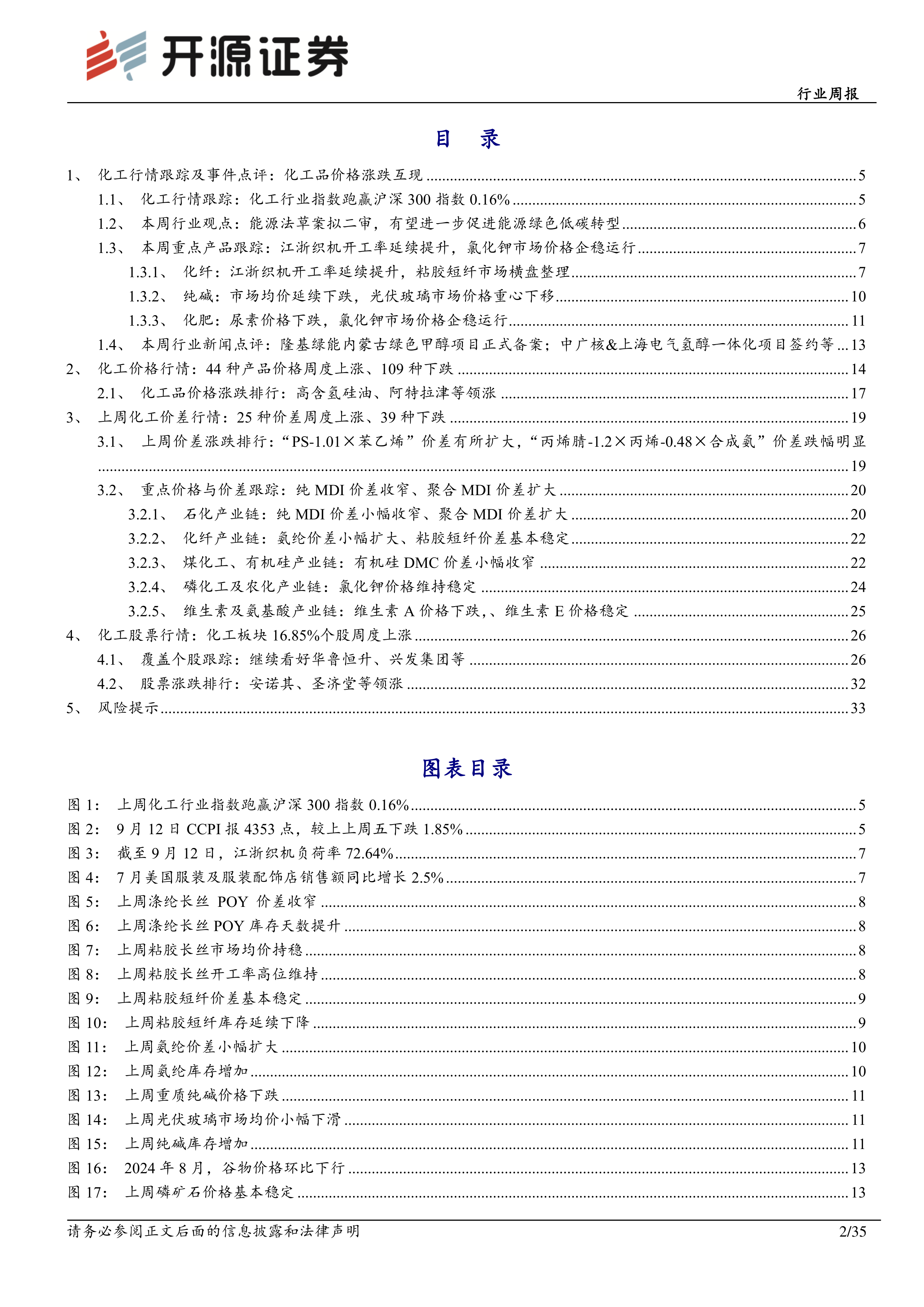 本周化工行业指数跑赢沪深300指数0.16%,但个股涨跌分化明显,上涨个股占比仅为16.85%。跟踪的226种化工产品中,44种价格上涨,109种下跌。重点产品方面,江浙织机开工率延续提升,但涤纶长丝价格下跌;粘胶长丝/短纤市场价格维稳;纯碱市场均价延续下跌;化肥市场尿素价格下跌,氯化钾价格企稳。