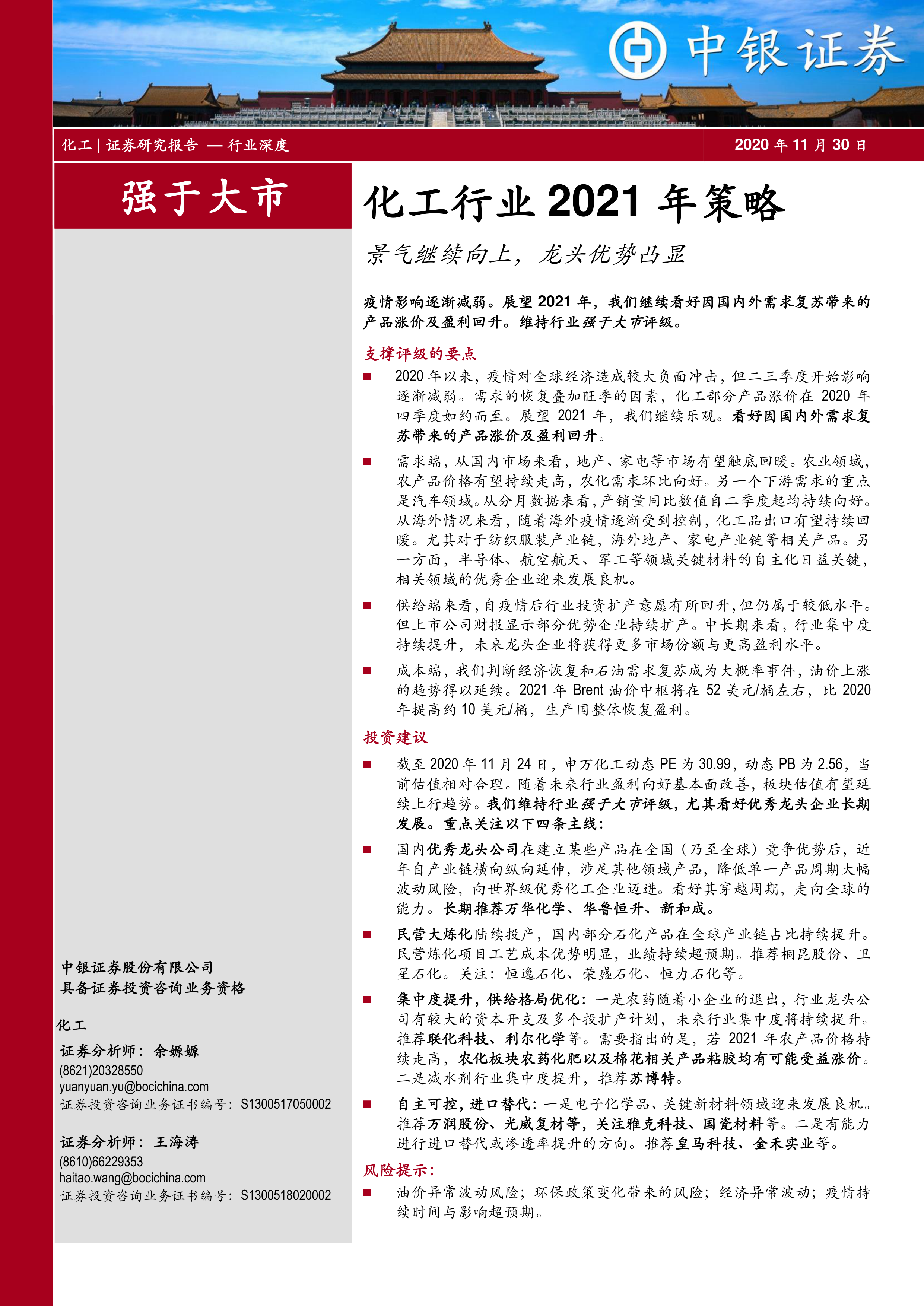 疫情影响逐渐减弱。展望 2021 年,我们继续看好因国内外需求复苏带来的产品涨价及盈利回升。 维持行业强于大市评级。
