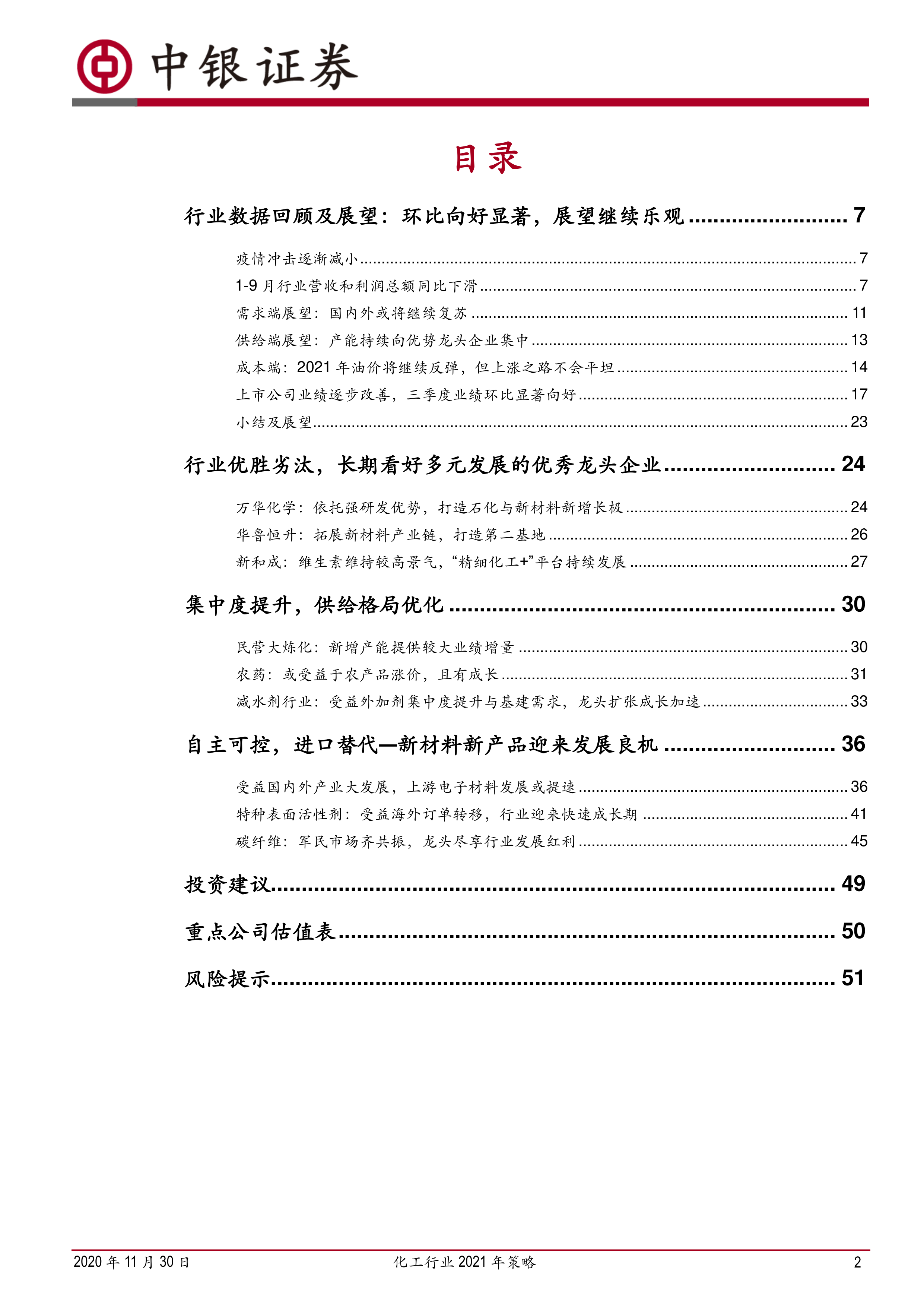 本报告对2021年化工行业进行了深入分析,认为行业景气度将继续向上,龙头企业优势凸显。 报告基于对宏观经济、行业供需、成本端以及上市公司业绩的综合分析,给出了“强于大市”的评级,并推荐了一系列具有投资价值的企业。 然而,投资者仍需关注报告中提到的潜在风险,并谨慎决策。 报告中大量图表数据支持了其分析结论,为投资者提供了较为全面的行业信息和投资参考。