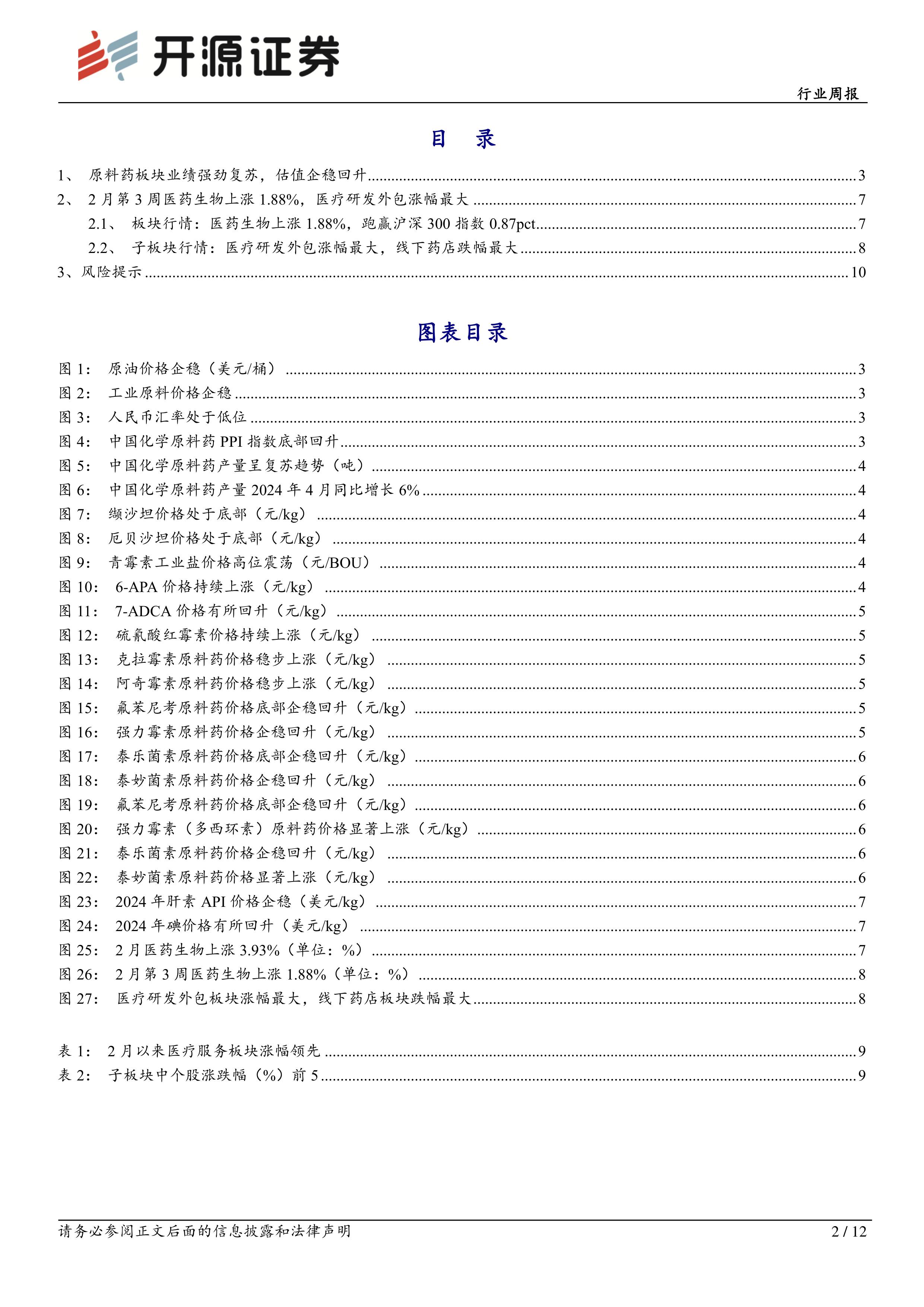 本报告通过对中国化学原料药行业及医药生物板块的市场数据进行分析,指出化学原料药行业整体呈现量升价稳的趋势,但不同细分领域表现差异显著。抗生素原料药价格持续上涨,部分动保原料药价格企稳回升,肝素和碘原料药价格也出现积极变化。医药生物板块整体表现良好,医疗研发外包板块涨幅领先。 报告同时提醒投资者关注政策波动、市场震荡和地缘政治等风险。 报告中大量图表数据直观地展现了市场趋势,为投资者提供了有价值的参考信息,但投资者仍需结合自身情况进行独立判断。