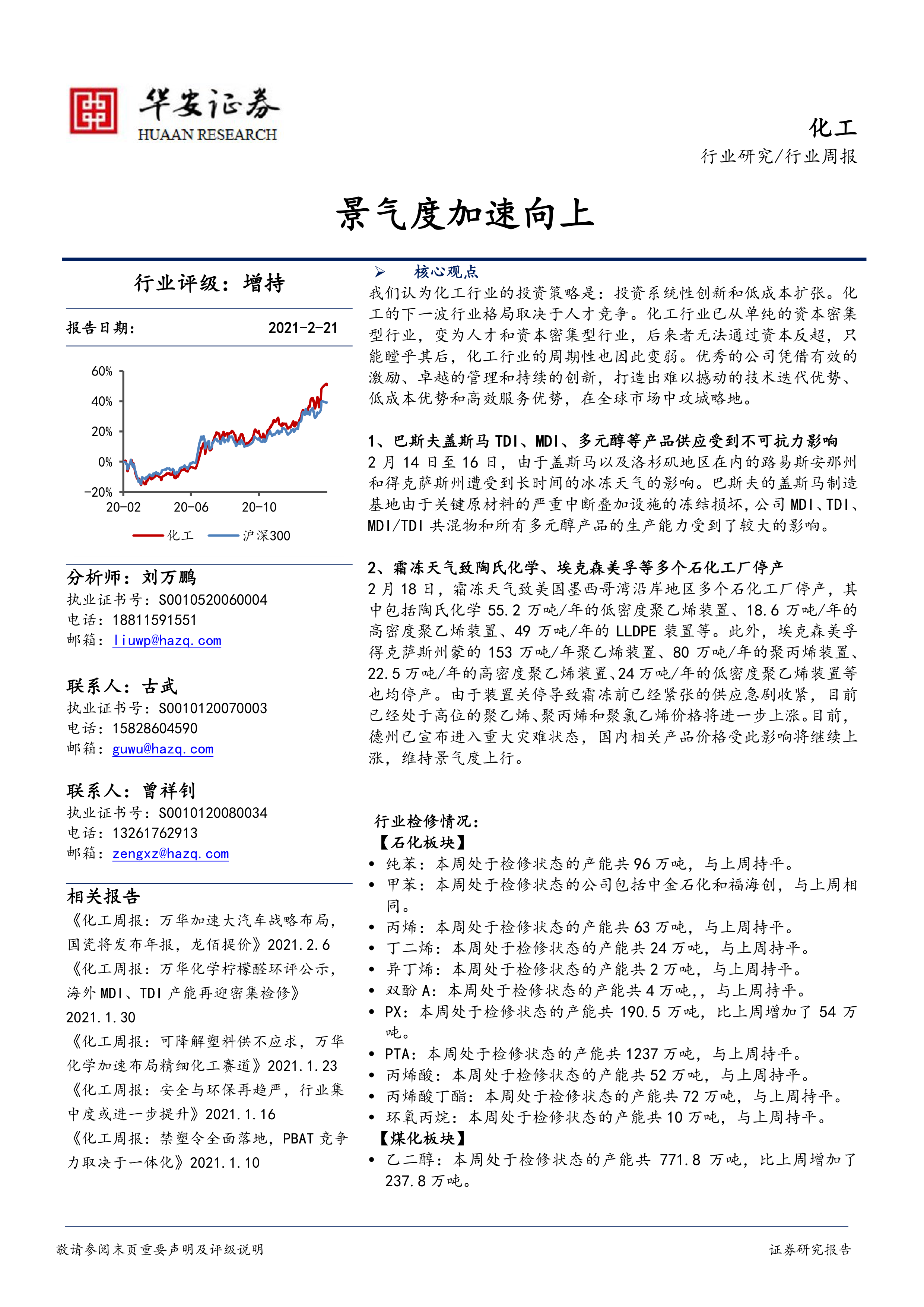 2、霜冻天气致陶氏化学、 埃克森美孚等多个石化工厂停产2 月 18 日, 霜冻天气致美国墨西哥湾沿岸地区多个石化工厂停产,其中包括陶氏化学 55.2 万吨/年的低密度聚乙烯装置、 18.6 万吨/年的高密度聚乙烯装置、 49 万吨/年的 LLDPE 装置等。 此外, 埃克森美孚得克萨斯州蒙的 153 万吨/年聚乙烯装置、 80 万吨/年的聚丙烯装置、22.5 万吨/年的高密度聚乙烯装置、 24 万吨/年的低密度聚乙烯装置等也均停产。 由于装置关停导致霜冻前已经紧张的供应急剧收紧,目前已经处于高位的聚乙烯、聚丙烯和聚氯乙烯价格将进一步上涨。目前,德州已宣布进入重大灾难状态,国内相关产品价格受此影响将继续上涨,维持景气度上行。