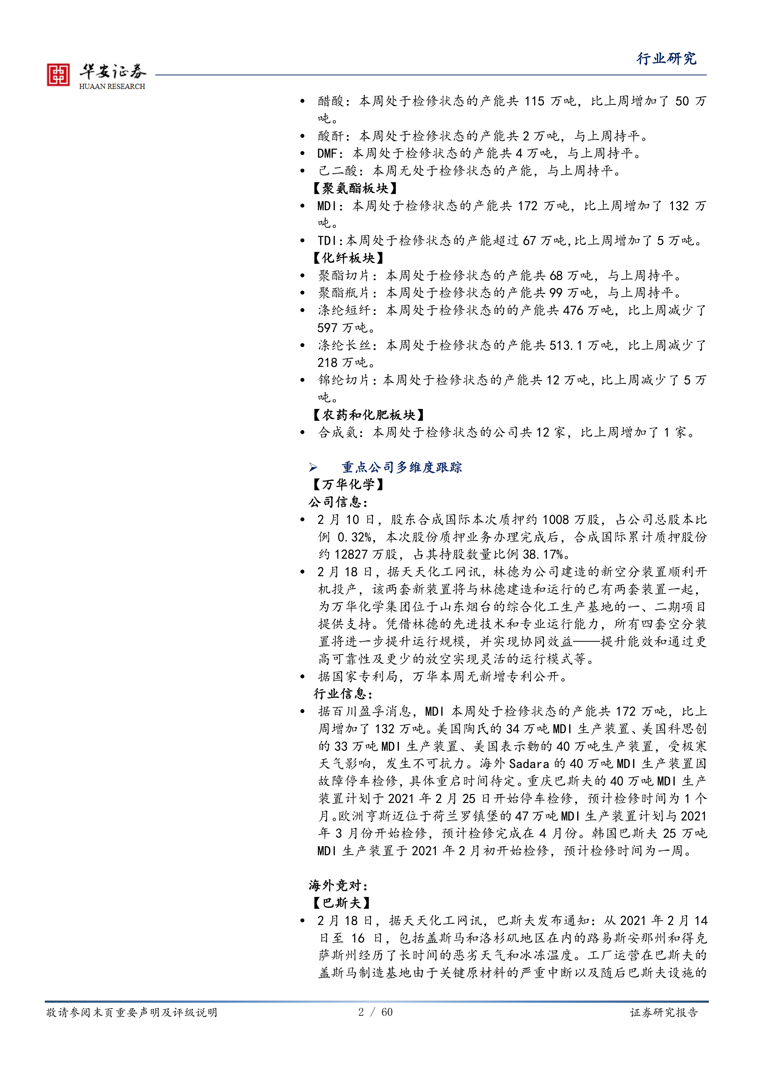 2 月 18 日, 据天天化工网讯,巴斯夫发布通知:从 2021 年 2 月 14日至 16 日,包括盖斯马和洛杉矶地区在内的路易斯安那州和得克萨斯州经历了长时间的恶劣天气和冰冻温度。工厂运营在巴斯夫的盖斯马制造基地由于关键原材料的严重中断以及随后巴斯夫设施的冻结损坏,已经受到了影响。因此,公司宣布 MDI、 TDI、 MDI/TDI 共混物和所有多元醇产品立即生效;据艾邦高分子讯,公司发明的抗黄变 TPU 应用于 Hamee 新 iPhone12 手机保护壳,这种创新的 TPU 用于多种材料的混合结构中,可在手机壳的整个使用寿命内防止其变色或泛黄,从而在保持外观和功能之间达到适当的平衡,同时保证Hamee 产品的高品质;据天天化工网讯,公司上海年产 16 万吨 TDI装置春节期间计划外停车,复产时间暂定。
