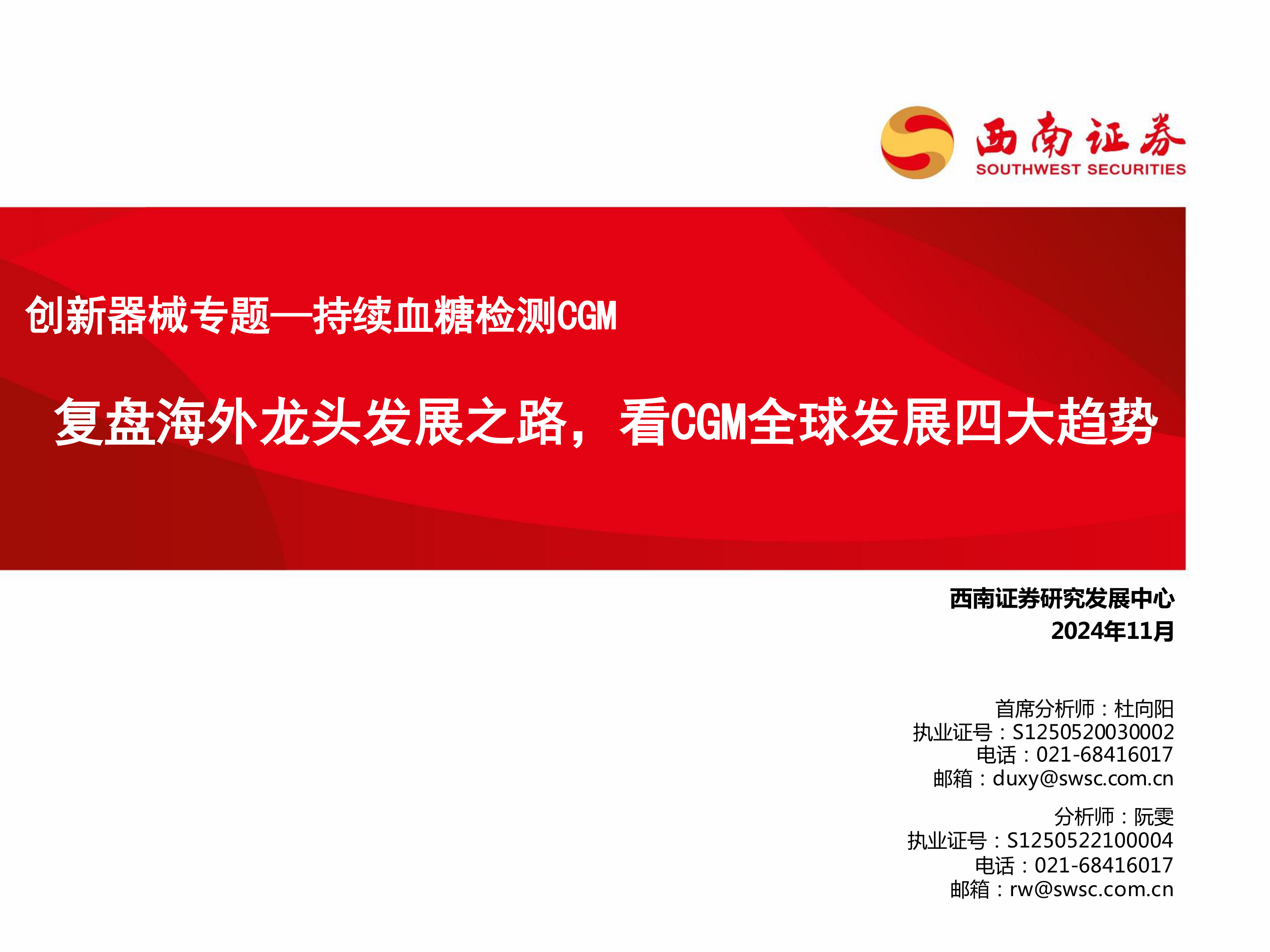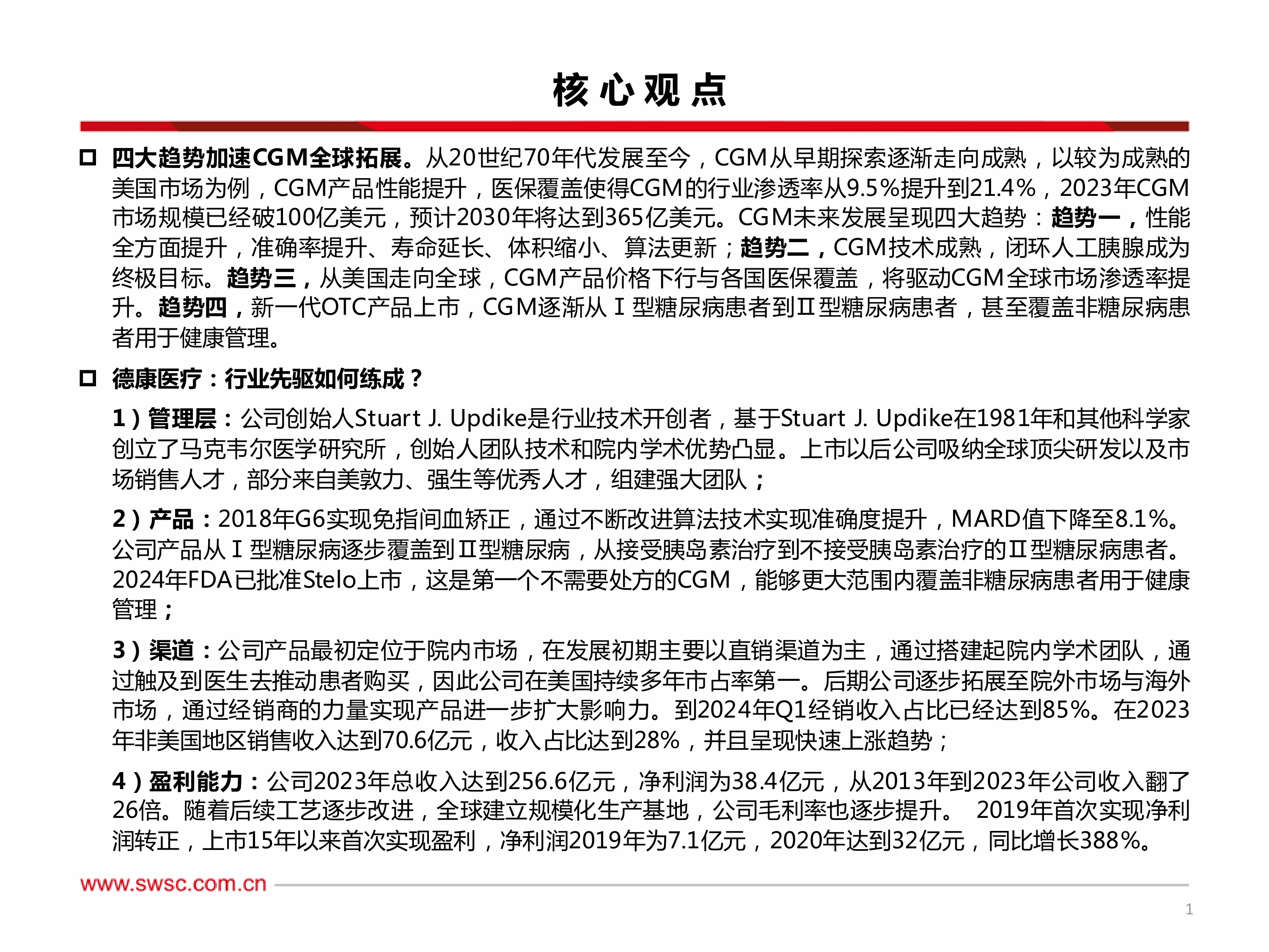 本报告的核心观点是:持续血糖监测系统(CGM)市场正经历快速发展,呈现四大趋势:性能全方面提升、闭环人工胰腺成为终极目标、全球市场拓展加速以及新一代OTC产品上市。德康医疗、雅培、美敦力、罗氏等公司在CGM市场竞争激烈,各有优势和战略。中国CGM市场渗透率较低,但市场潜力巨大。