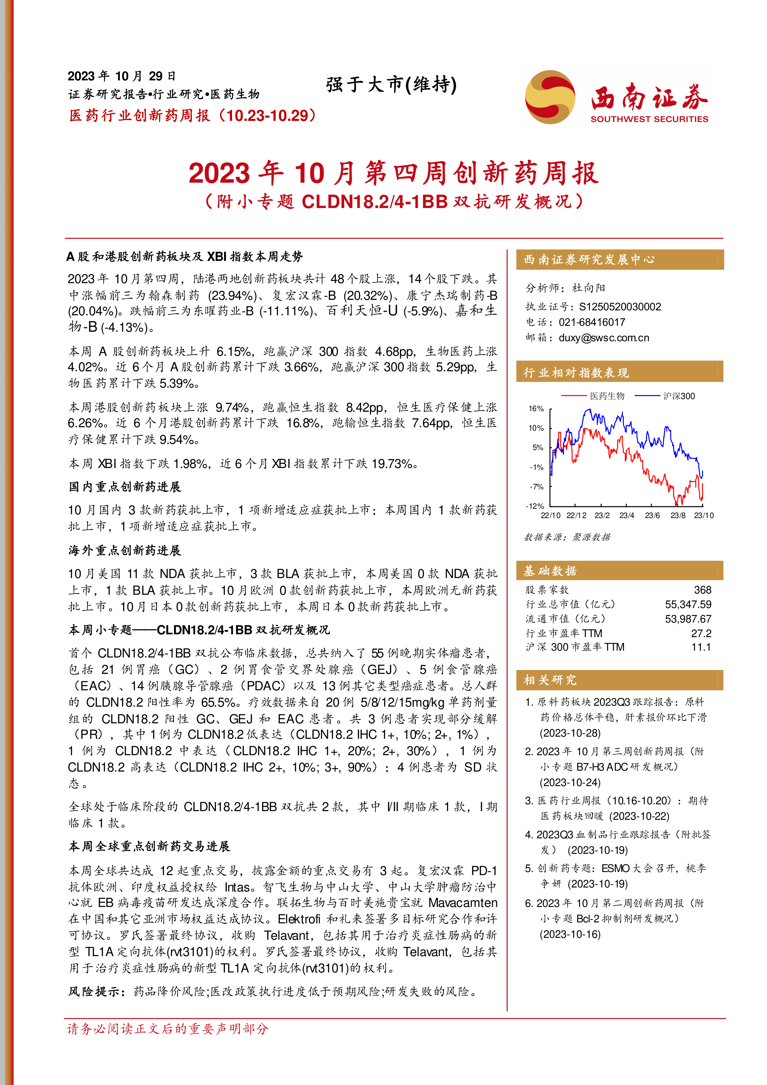 医药行业创新药周报:2023年10月第四周创新药周报(附小专题CLDN18.2/4-1BB双抗研发概况)