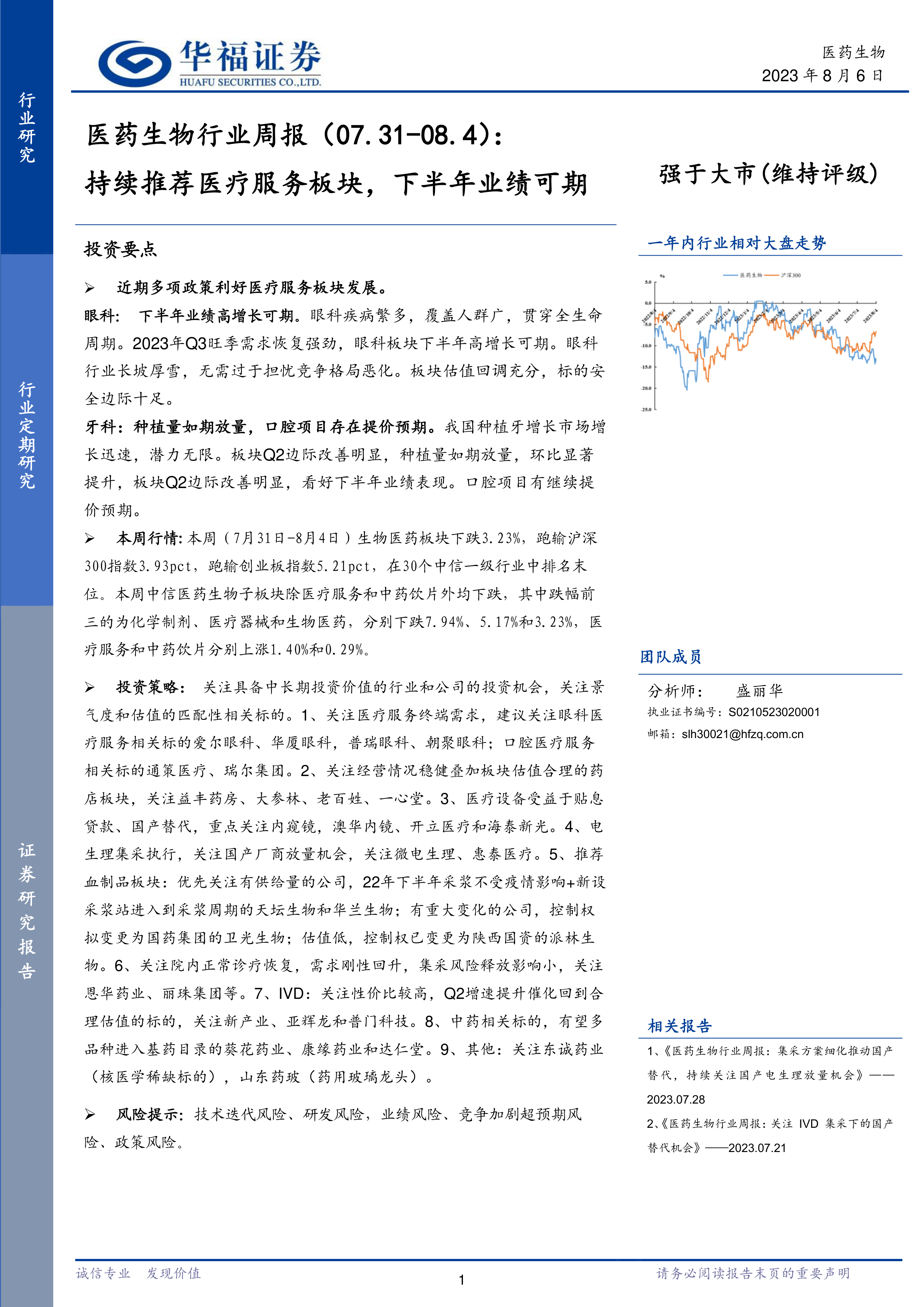 本报告的核心观点是:持续推荐医疗服务板块,尤其看好眼科和牙科领域在下半年的业绩增长。 基于近期利好政策、旺季需求回暖以及估值回调充分等因素,该板块具备显著的投资价值。同时,报告也分析了本周医药行业整体行情、重点事件以及部分重点公司的动态,并提出了相应的投资建议和风险提示。