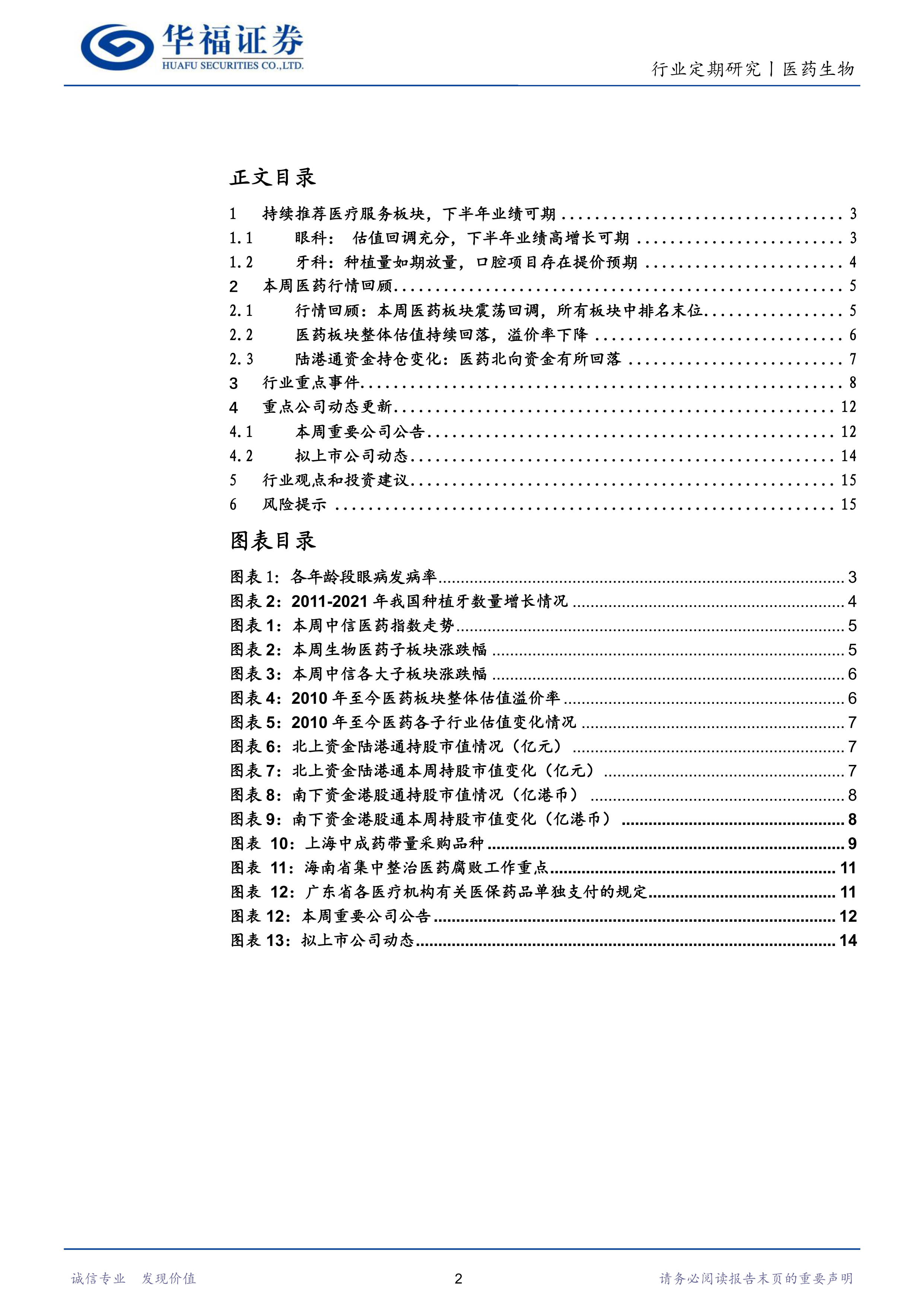 本报告基于对近期政策、市场行情和公司动态的分析,持续推荐医疗服务板块,尤其看好眼科和牙科领域在下半年的业绩增长。报告详细分析了该板块的增长潜力、估值水平以及潜在风险,并对其他细分领域也提供了投资建议。投资者应结合自身风险承受能力和投资目标,谨慎决策。 报告中提到的数据和信息仅供参考,不构成投资建议。