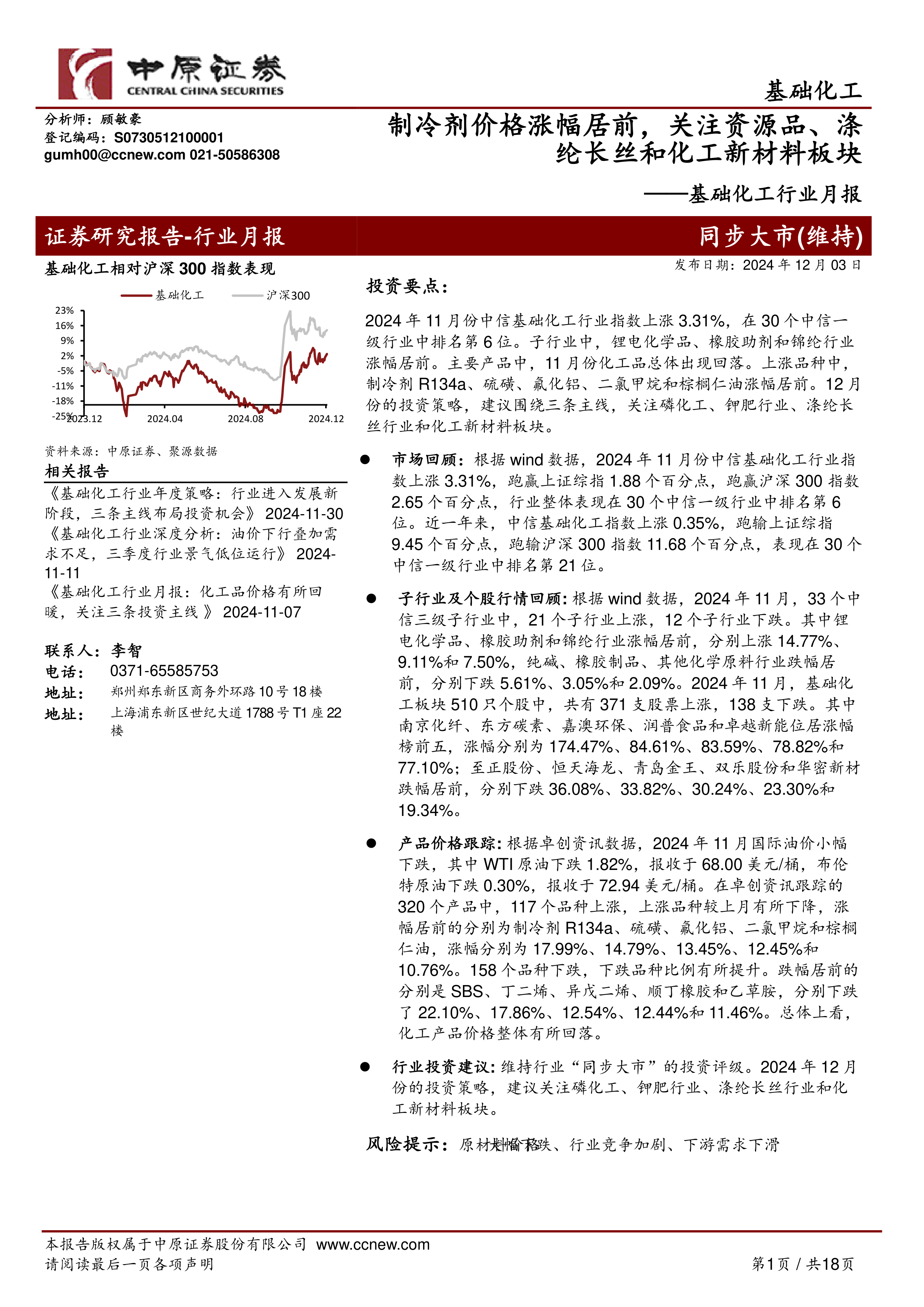 2024年11月份中信基础化工行业指数上涨3.31%,在30个中信一级行业中排名第6位。子行业中,锂电化学品、橡胶助剂和锦纶行业涨幅居前。主要产品中,11月份化工品总体出现回落。上涨品种中,制冷剂R134a、硫磺、氟化铝、二氯甲烷和棕榈仁油涨幅居前。12月份的投资策略,建议围绕三条主线,关注磷化工、钾肥行业、涤纶长丝行业和化工新材料板块。