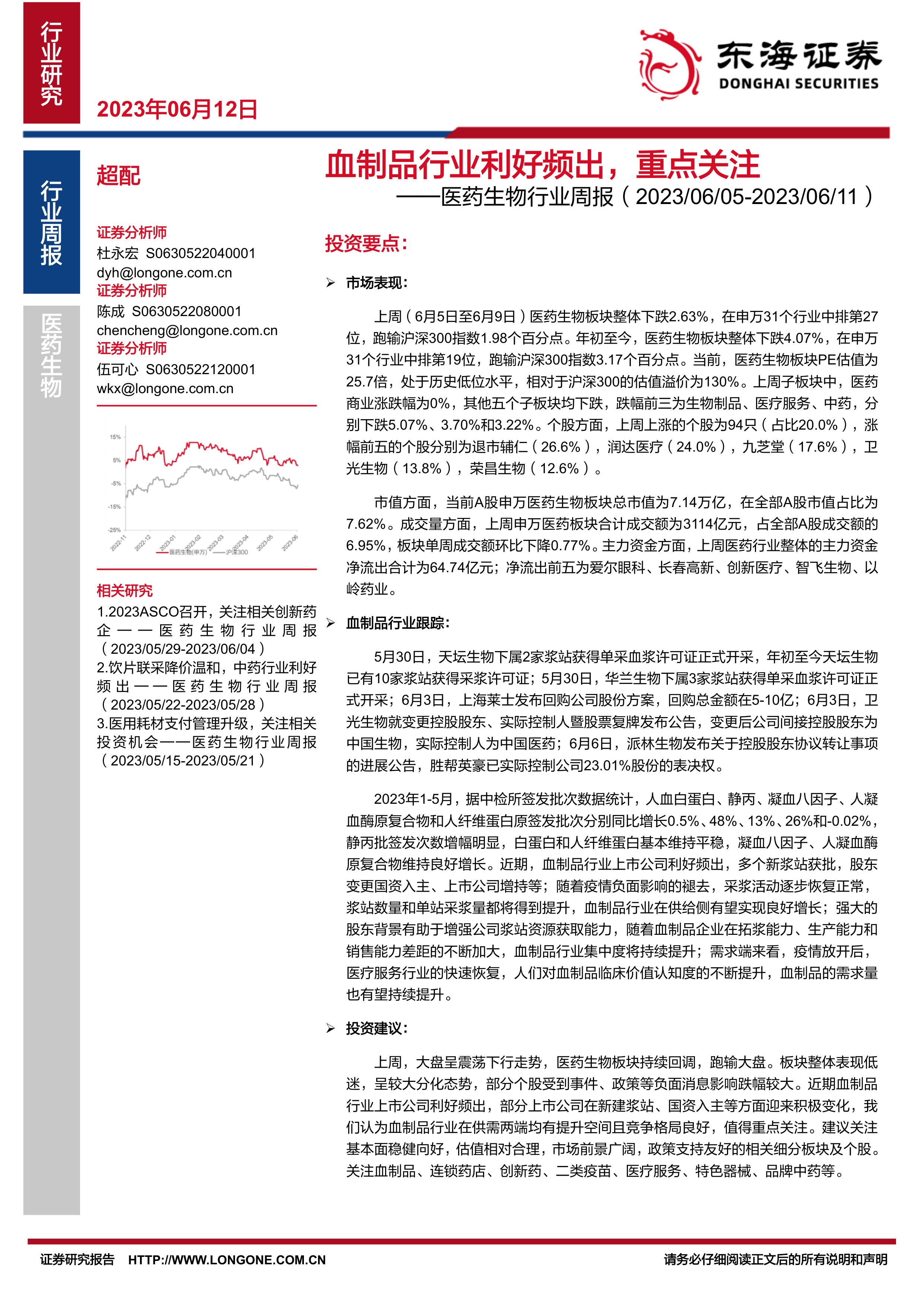 2023年1-5月,据中检所签发批次数据统计,人血白蛋白、静丙、凝血八因子、人凝血酶原复合物和人纤维蛋白原签发批次分别同比增长0.5%、48%、13%、26%和-0.02%,静丙批签发次数增幅明显,白蛋白和人纤维蛋白基本维持平稳,凝血八因子、人凝血酶原复合物维持良好增长。近期,血制品行业上市公司利好频出,多个新浆站获批,股东变更国资入主、上市公司增持等;随着疫情负面影响的褪去,采浆活动逐步恢复正常,浆站数量和单站采浆量都将得到提升,血制品行业在供给侧有望实现良好增长;强大的股东背景有助于增强公司浆站资源获取能力,随着血制品企业在拓浆能力、生产能力和销售能力差距的不断加大,血制品行业集中度将持续提升;需求端来看,疫情放开后,医疗服务行业的快速恢复,人们对血制品临床价值认知度的不断提升,血制品的需求量也有望持续提升。