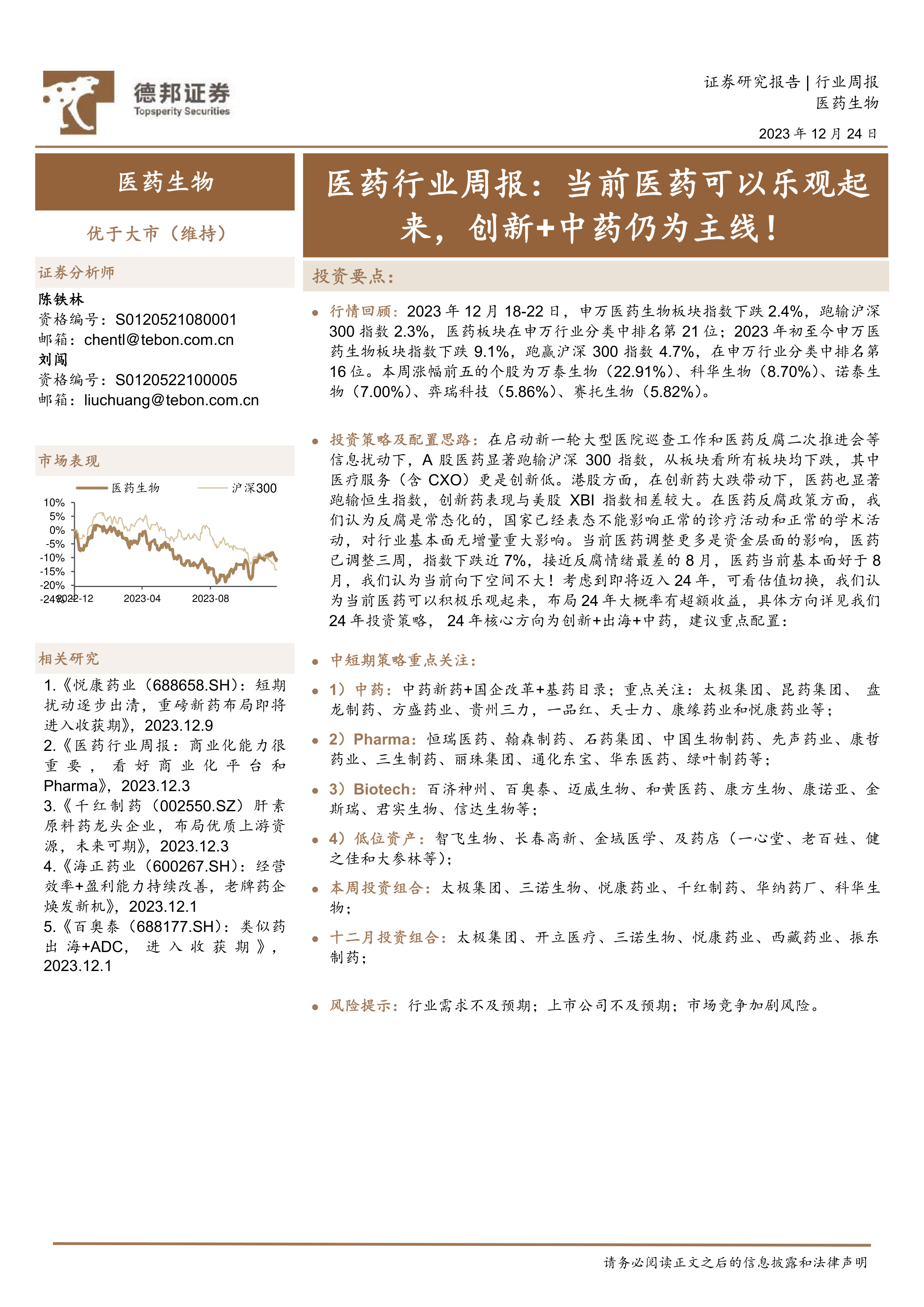 行情回顾:2023年12月18-22日,申万医药生物板块指数下跌2.4%,跑输沪深300指数2.3%,医药板块在申万行业分类中排名第21位;2023年初至今申万医药生物板块指数下跌9.1%,跑赢沪深300指数4.7%,在申万行业分类中排名第16位。本周涨幅前五的个股为万泰生物(22.91%)、科华生物(8.70%)、诺泰生物(7.00%)、弈瑞科技(5.86%)、赛托生物(5.82%)。