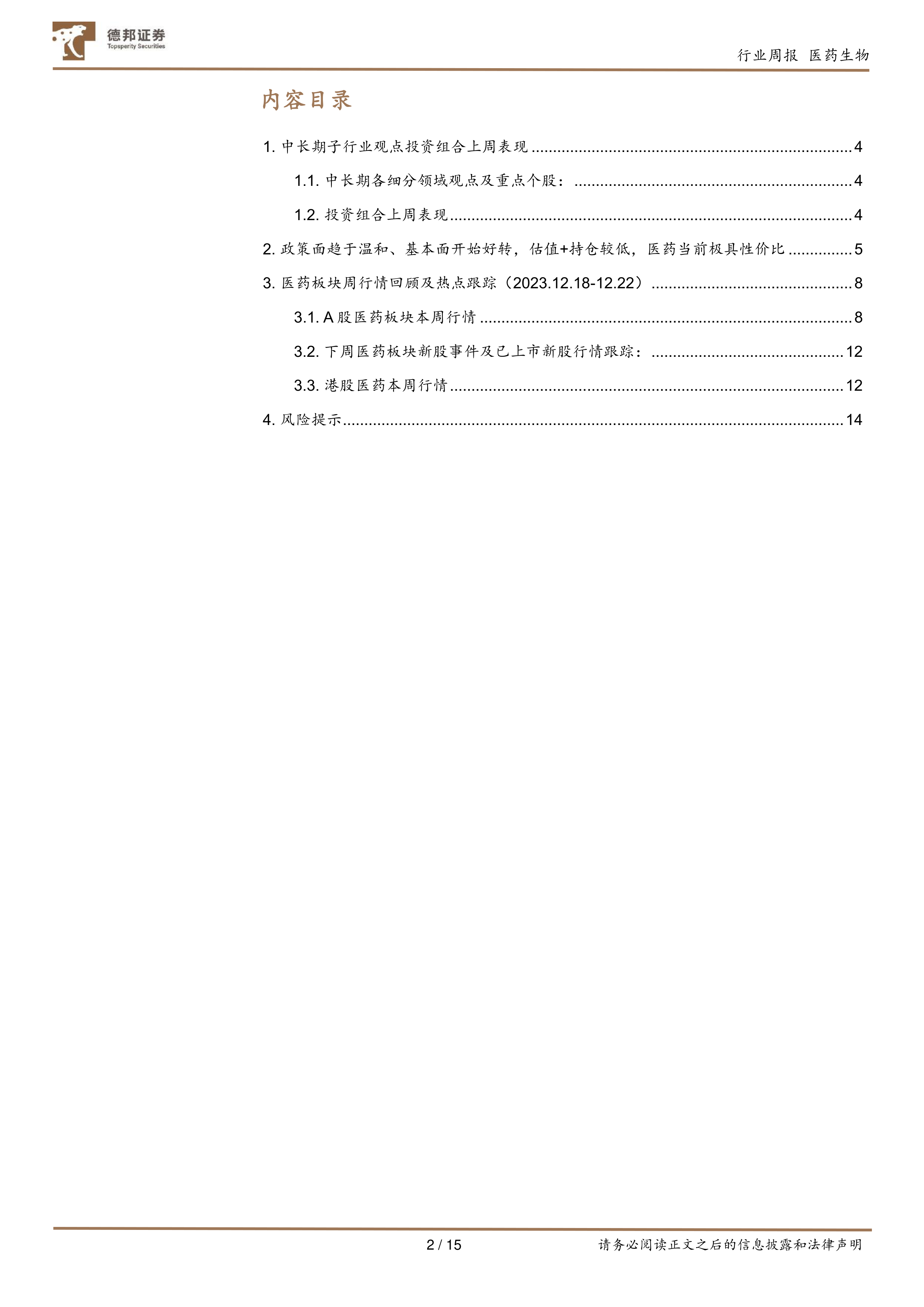 报告首先回顾了2023年12月18日至22日A股和港股医药板块的市场表现,详细列举了板块指数涨跌幅、跑赢跑输情况以及个股涨跌幅排名。数据显示,A股医药板块本周下跌2.4%,跑输沪深300指数2.3%;港股医疗保健指数下跌6.2%,跑输恒生指数3.5%。 报告还分析了沪深股通资金的增减持情况,以及大宗交易情况,为投资者提供更全面的市场信息。