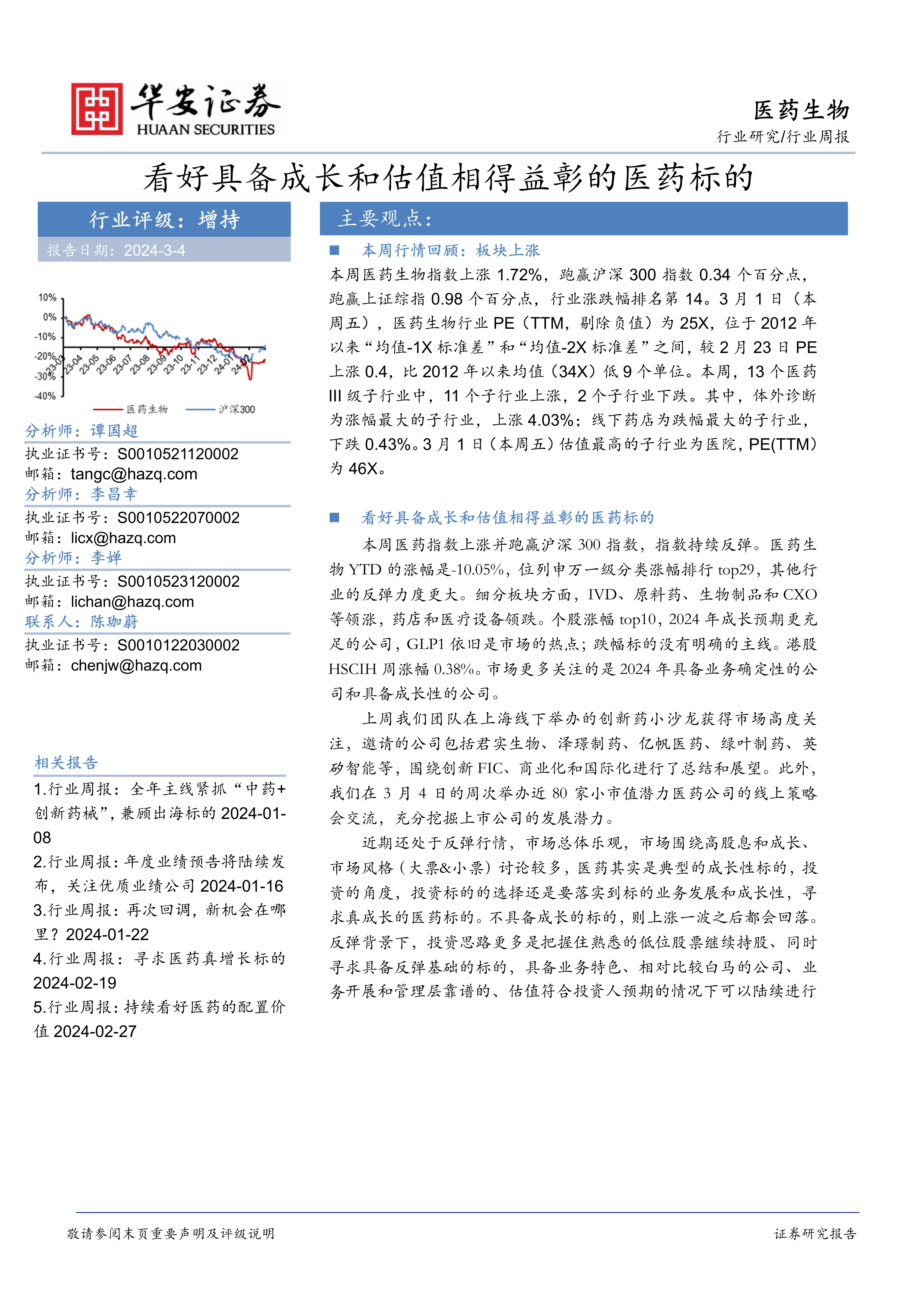 本报告对医药生物行业近期市场表现进行了数据分析,并基于对行业发展趋势和公司基本面的判断,提出了2024年医药投资策略,建议投资者关注具备成长性和合理估值的标的,特别是中药、创新药、创新器械以及具备国际化能力的公司。报告还提供了具体的个股推荐,为投资者提供了参考依据。 然而,投资者需注意报告中提到的政策风险、竞争风险和股价异常波动风险。 最终的投资决策应基于自身的风险承受能力和投资目标。