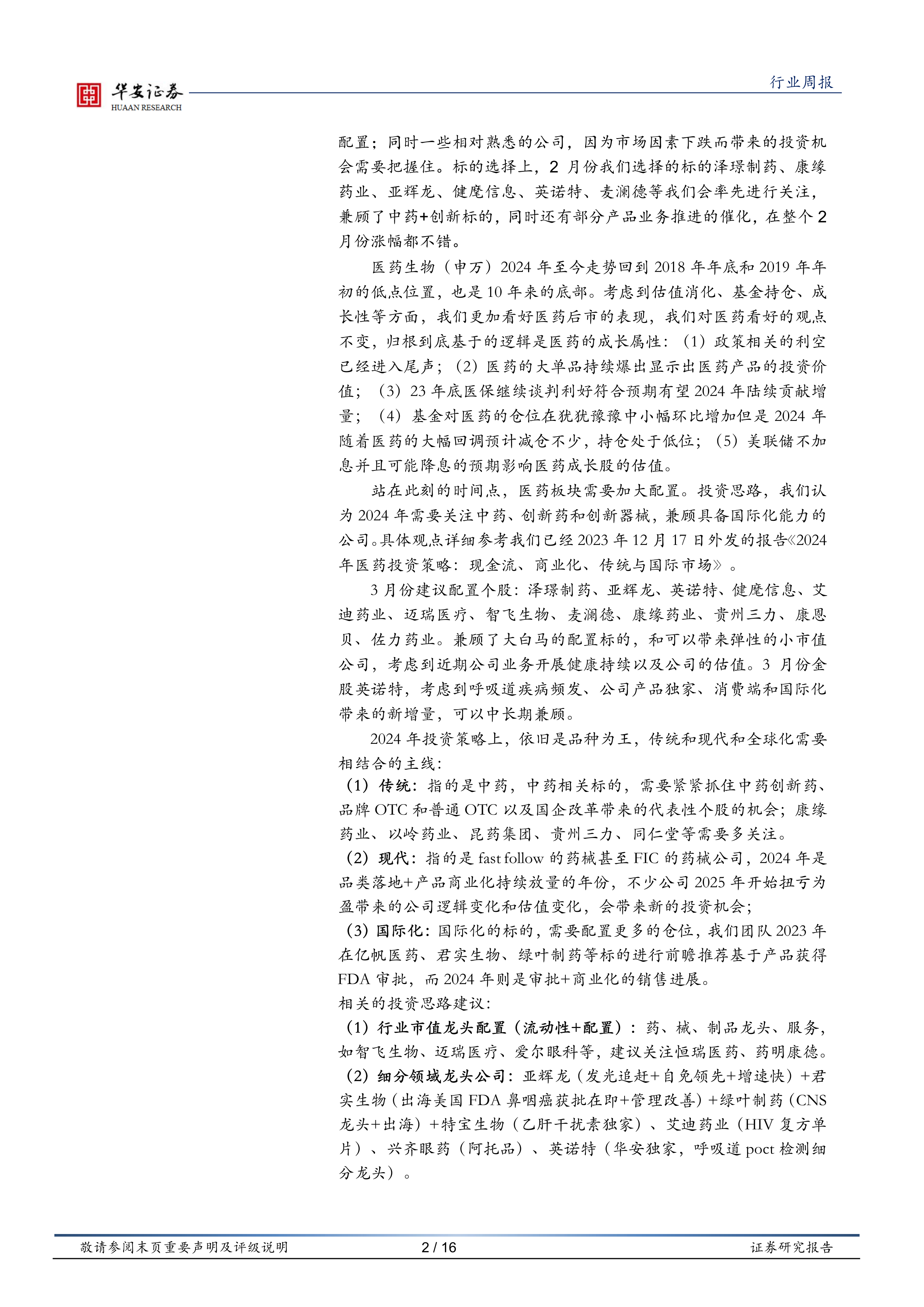 报告建议投资者关注中药、创新药和创新器械领域,同时兼顾具备国际化能力的公司。 报告还提供了具体的个股推荐,涵盖大市值龙头股和具有增长潜力的中小市值公司。